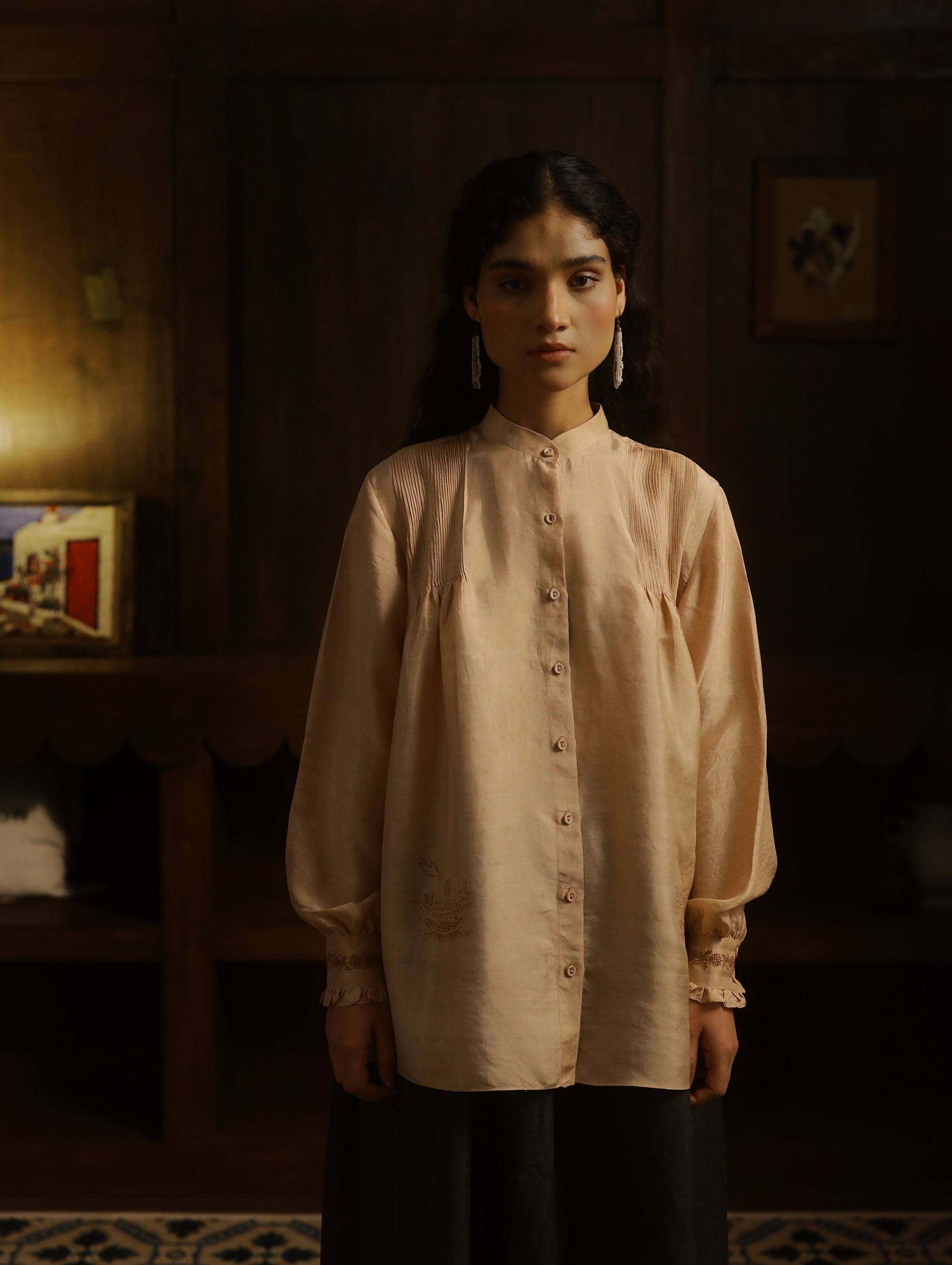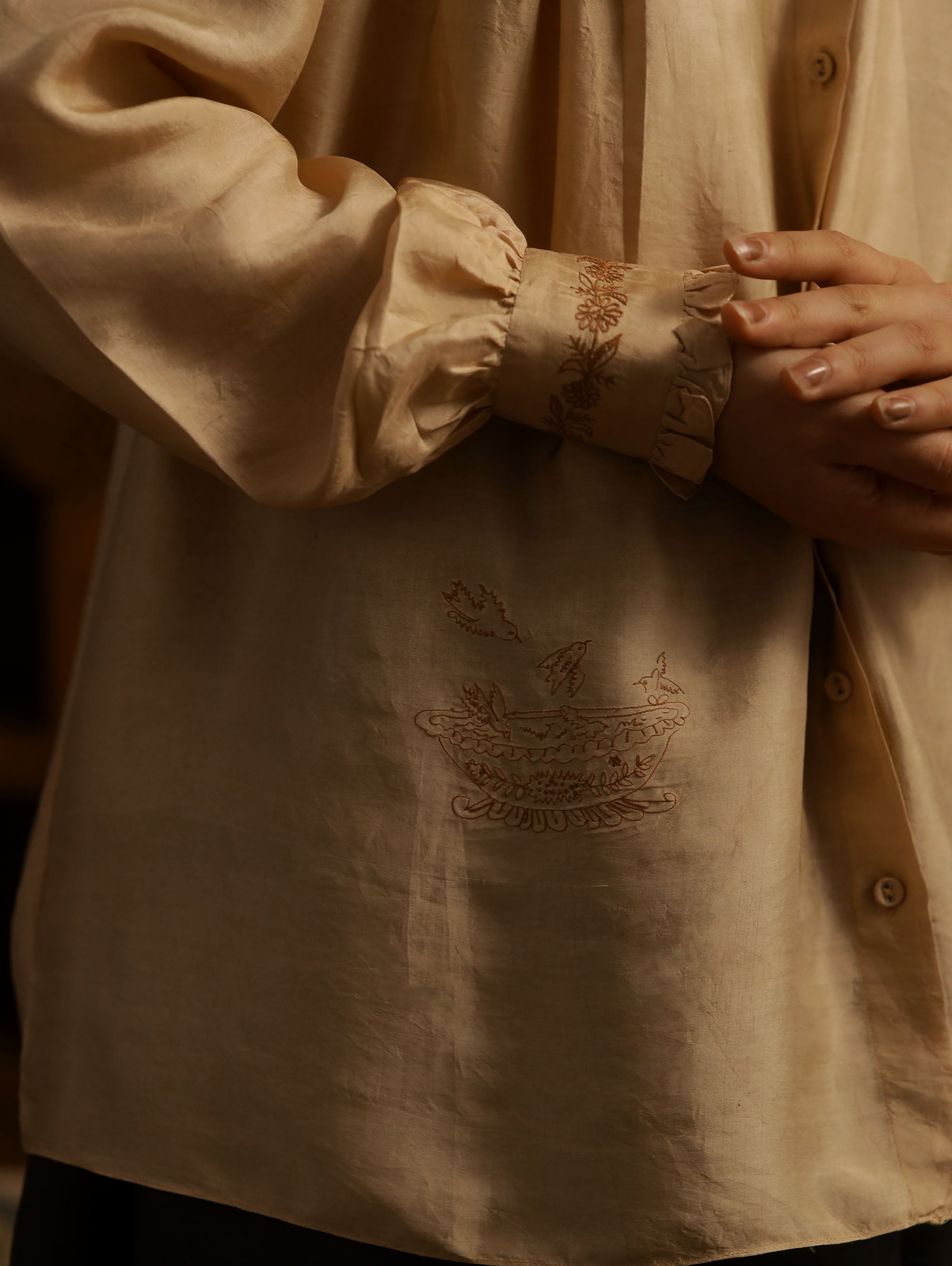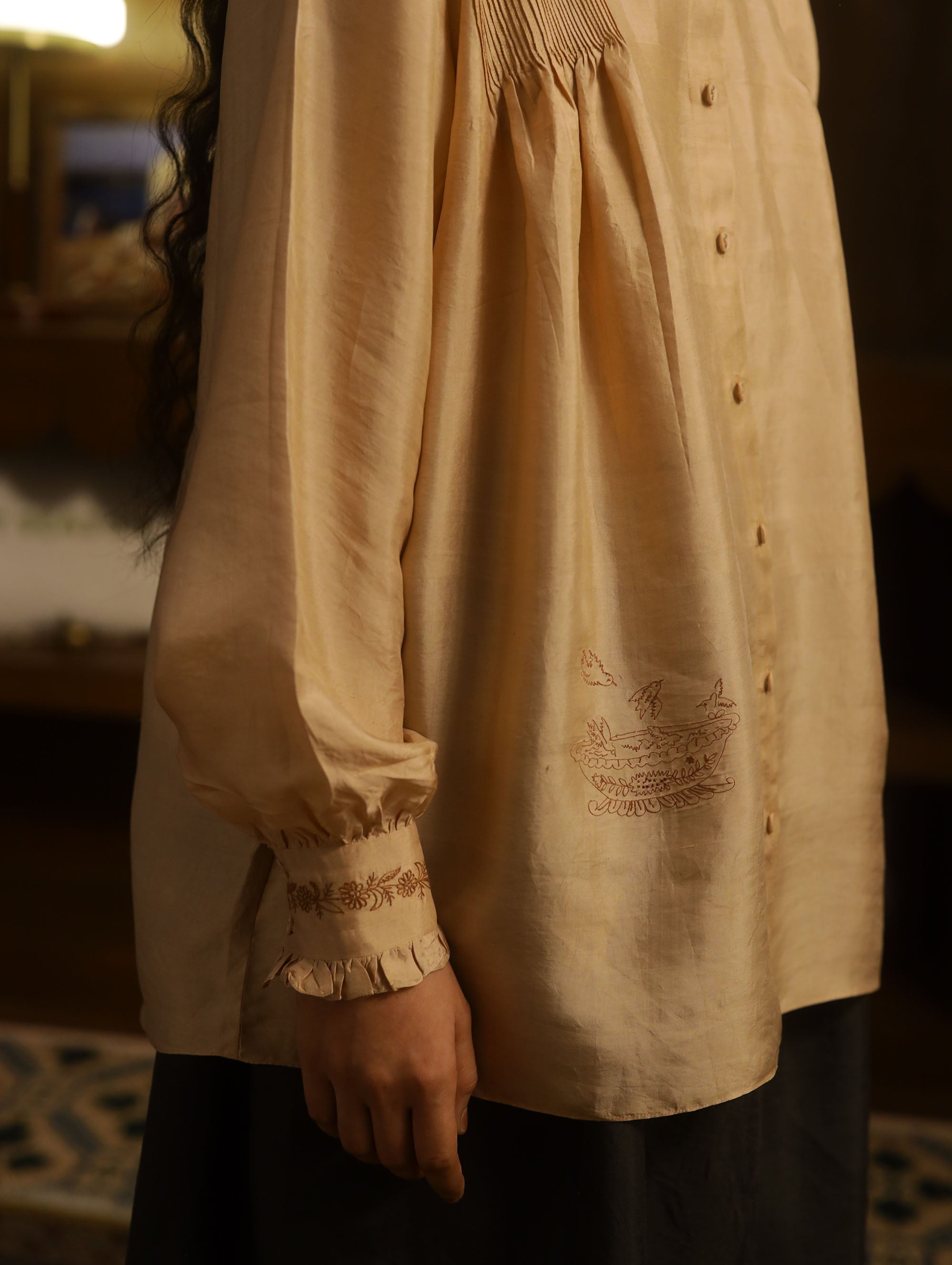 A long flowy top with banded collar neckline, front button placket opening, with fine pintucks on the shoulders, voluminous sleeves, broad cuffs with ruffle details along the rim of the cuffs. The back has a short yoke with gathers secured with a flat felled seam. The garment is detailed with monotone delicate embroidery on the front bottom and on the cuffs.