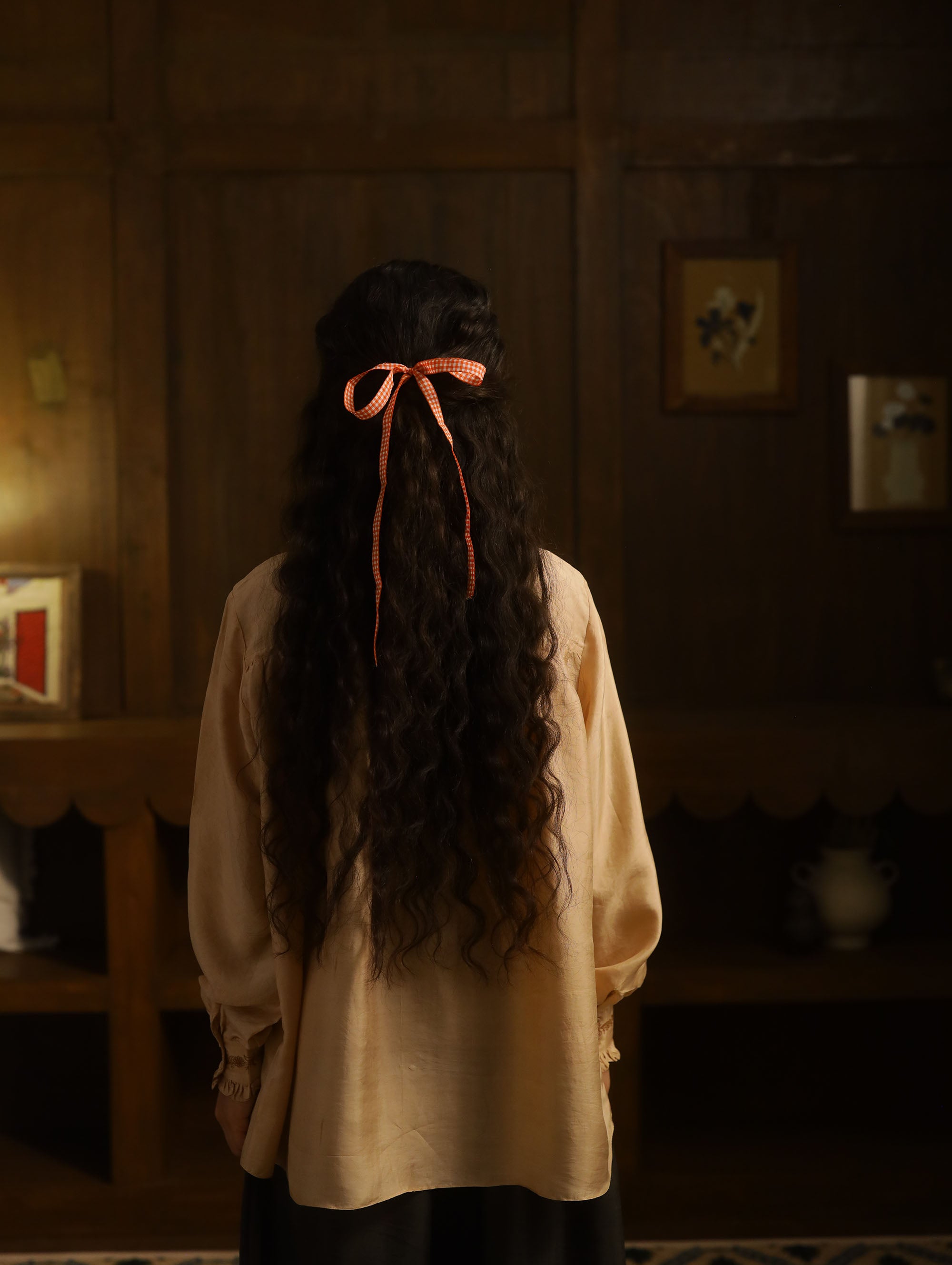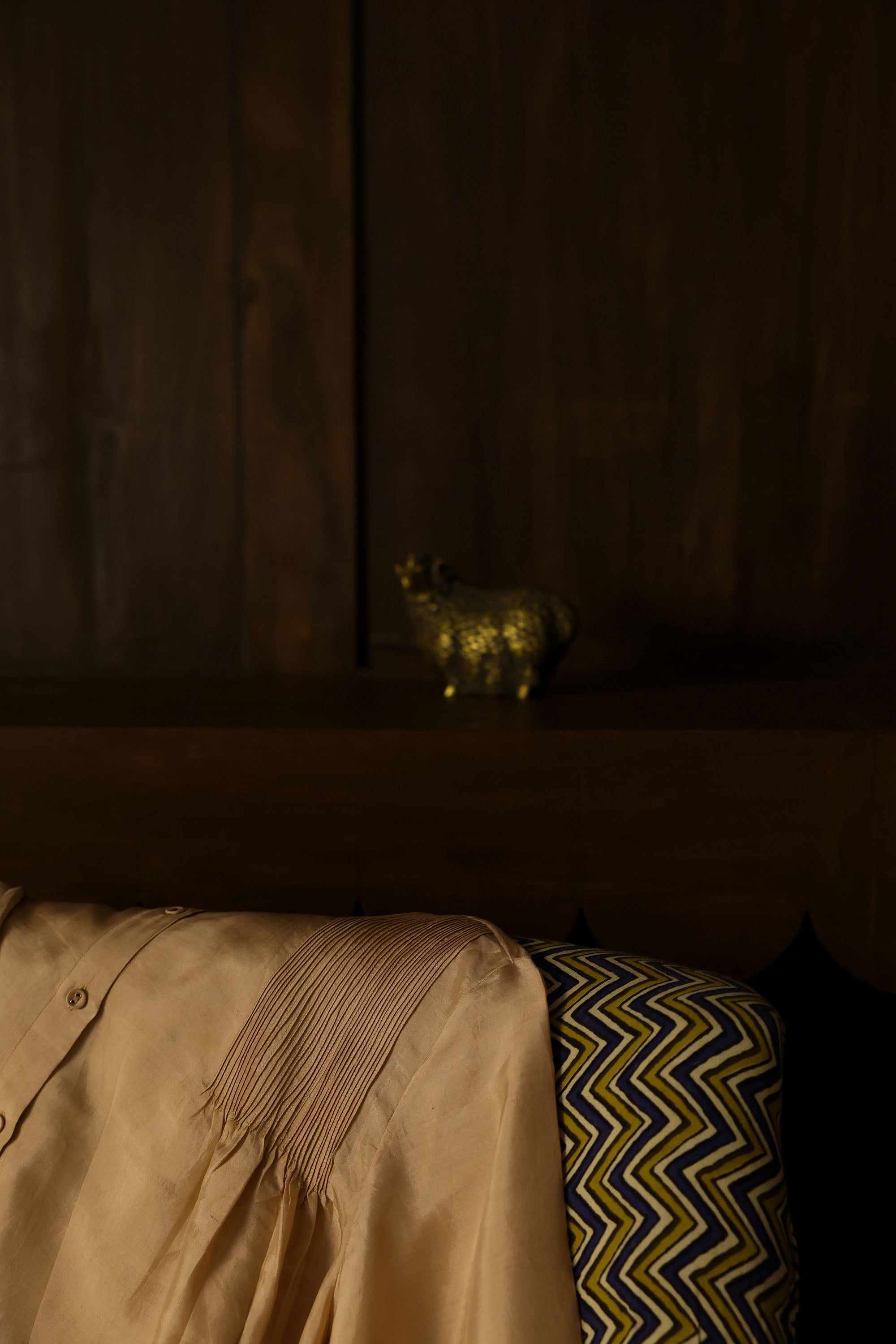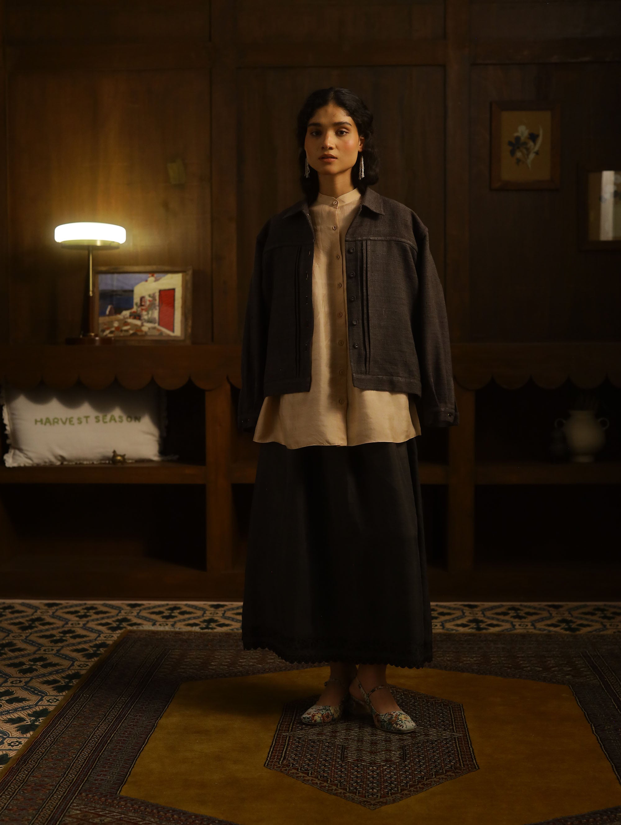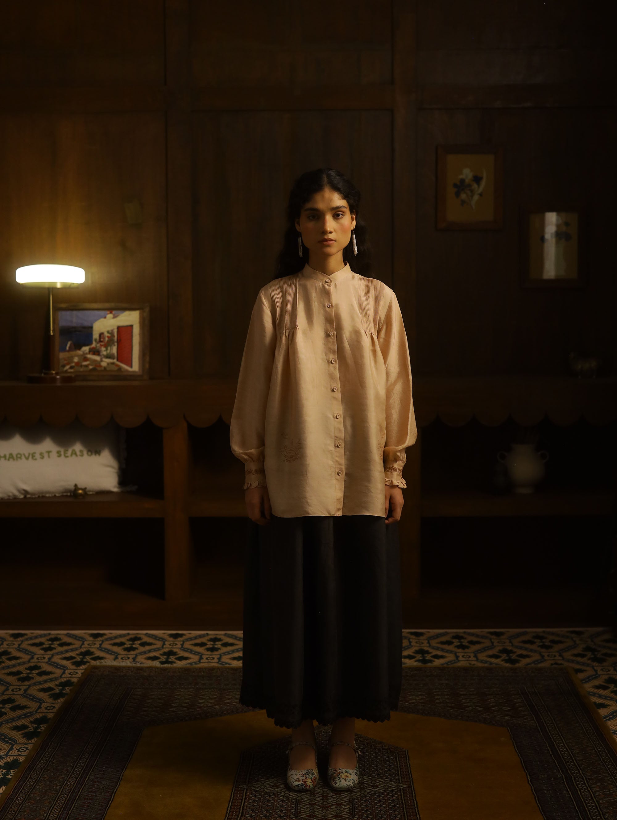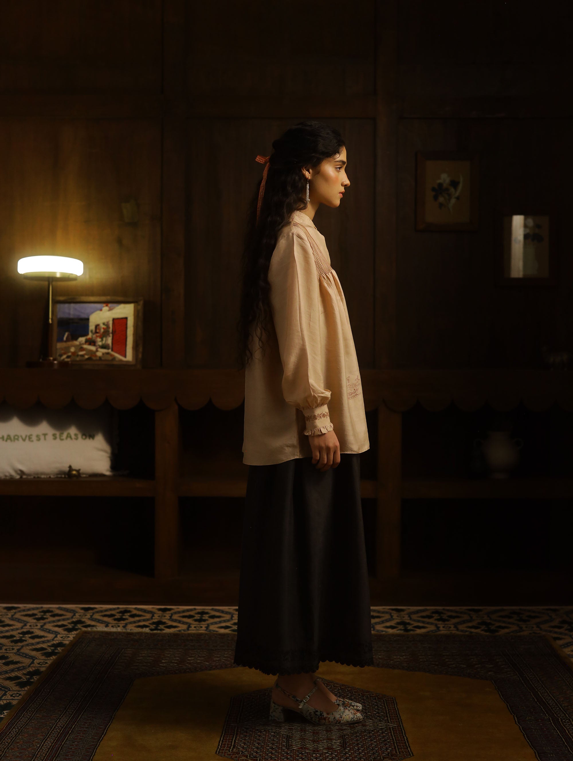 The top is constructed in a three ply handloomed mulberry silk in 55 gsm. The silk has a characteristic sheen and slubs in places, oweing to the hand woven nature of the material.