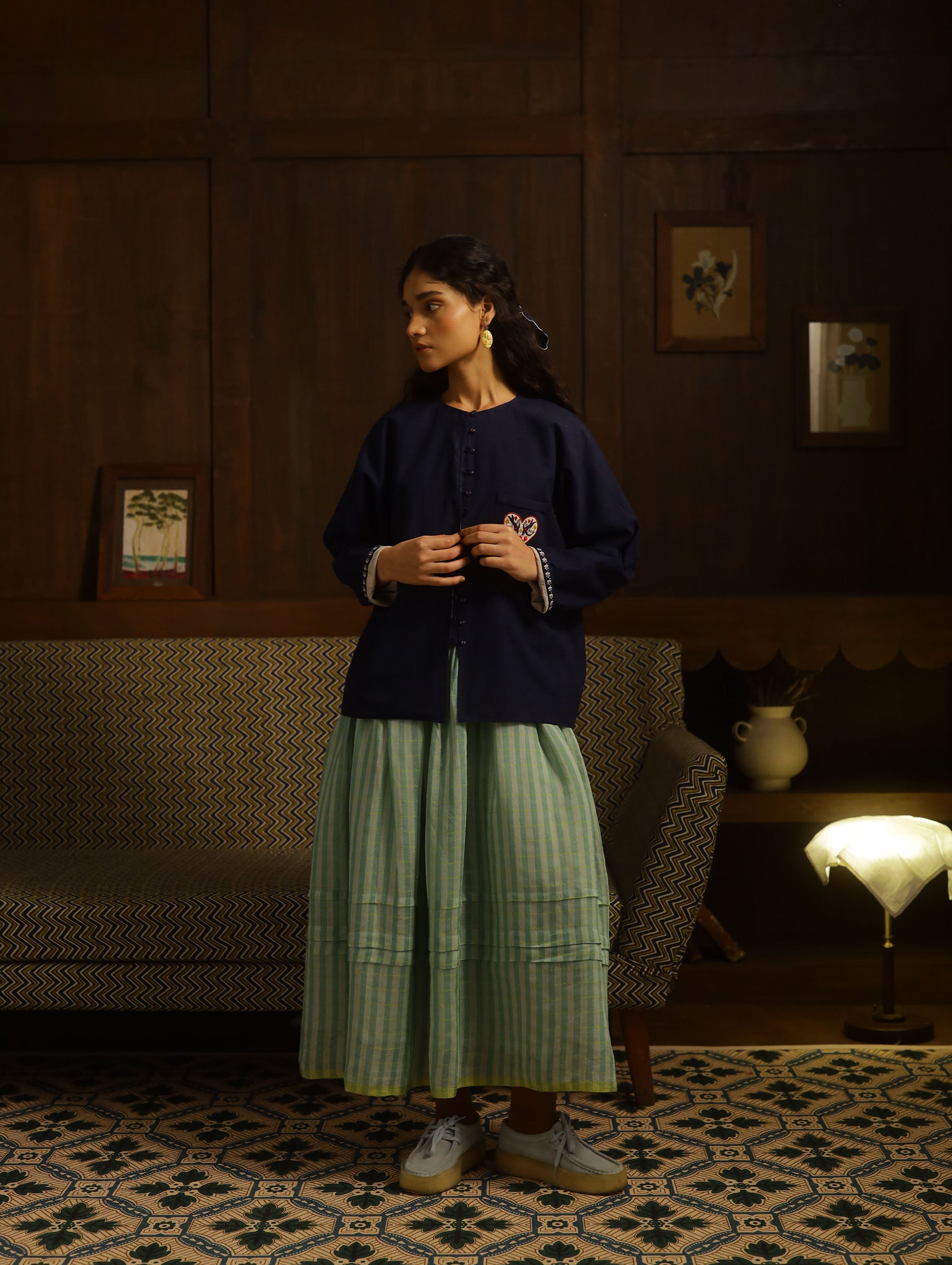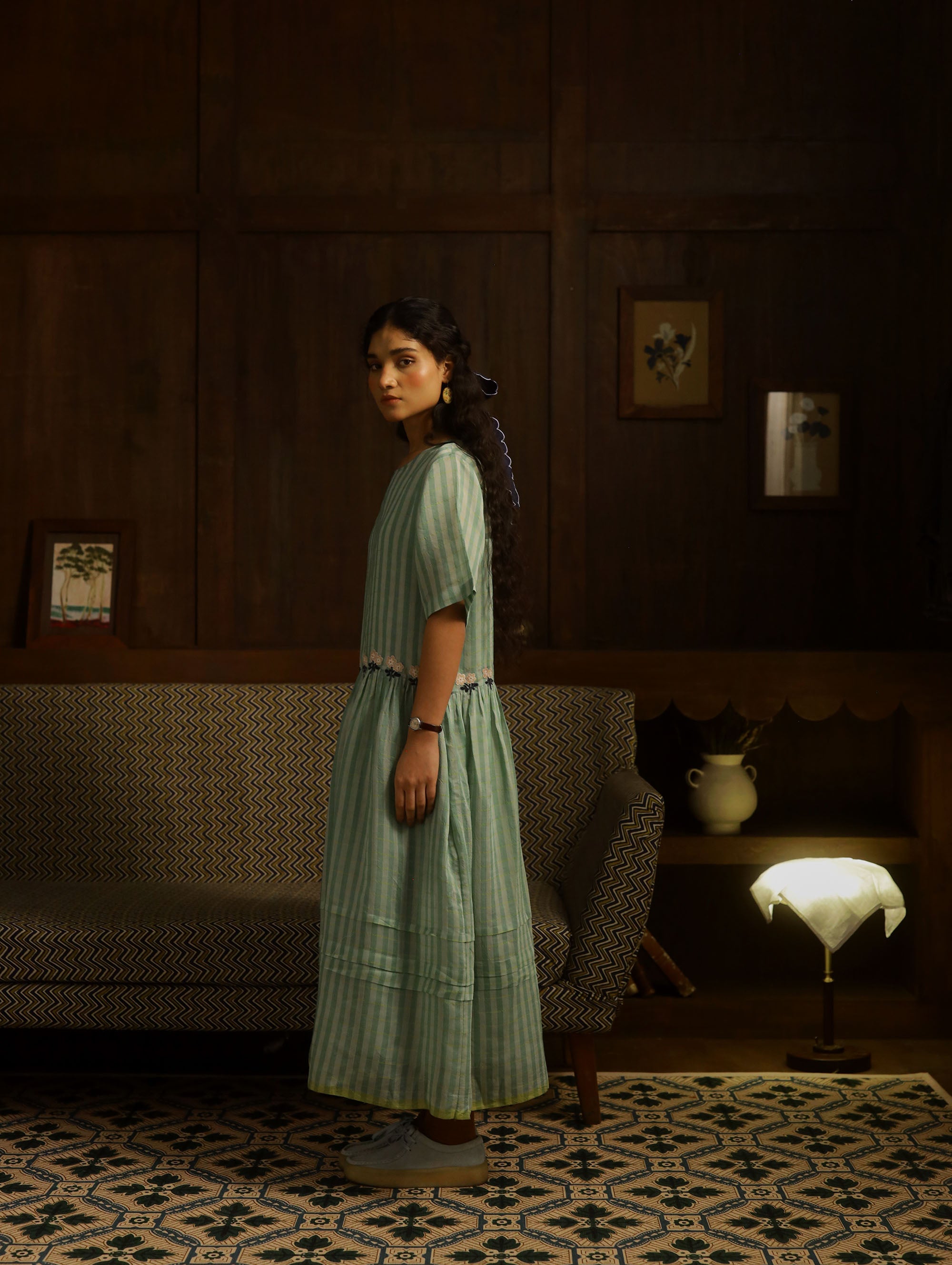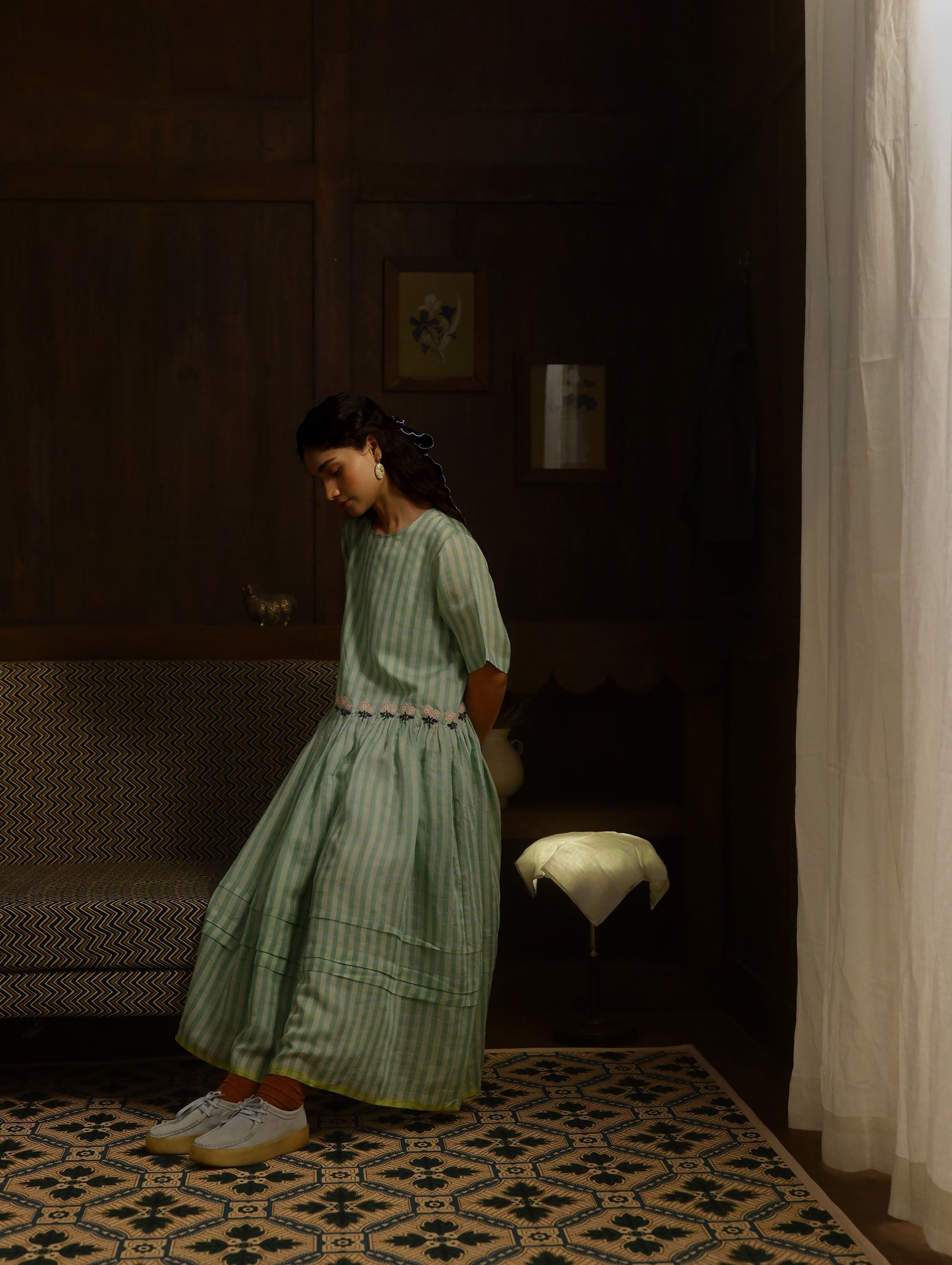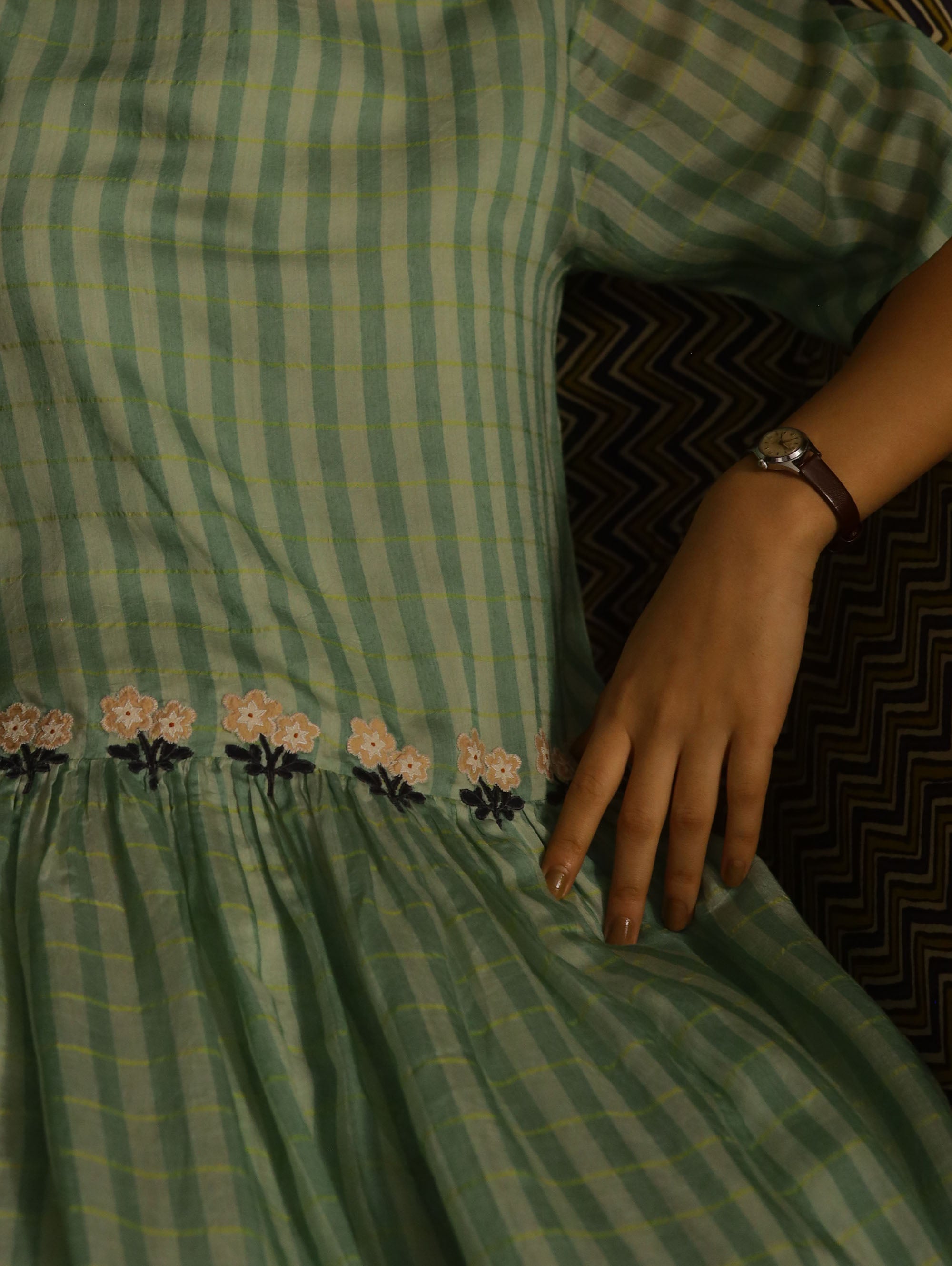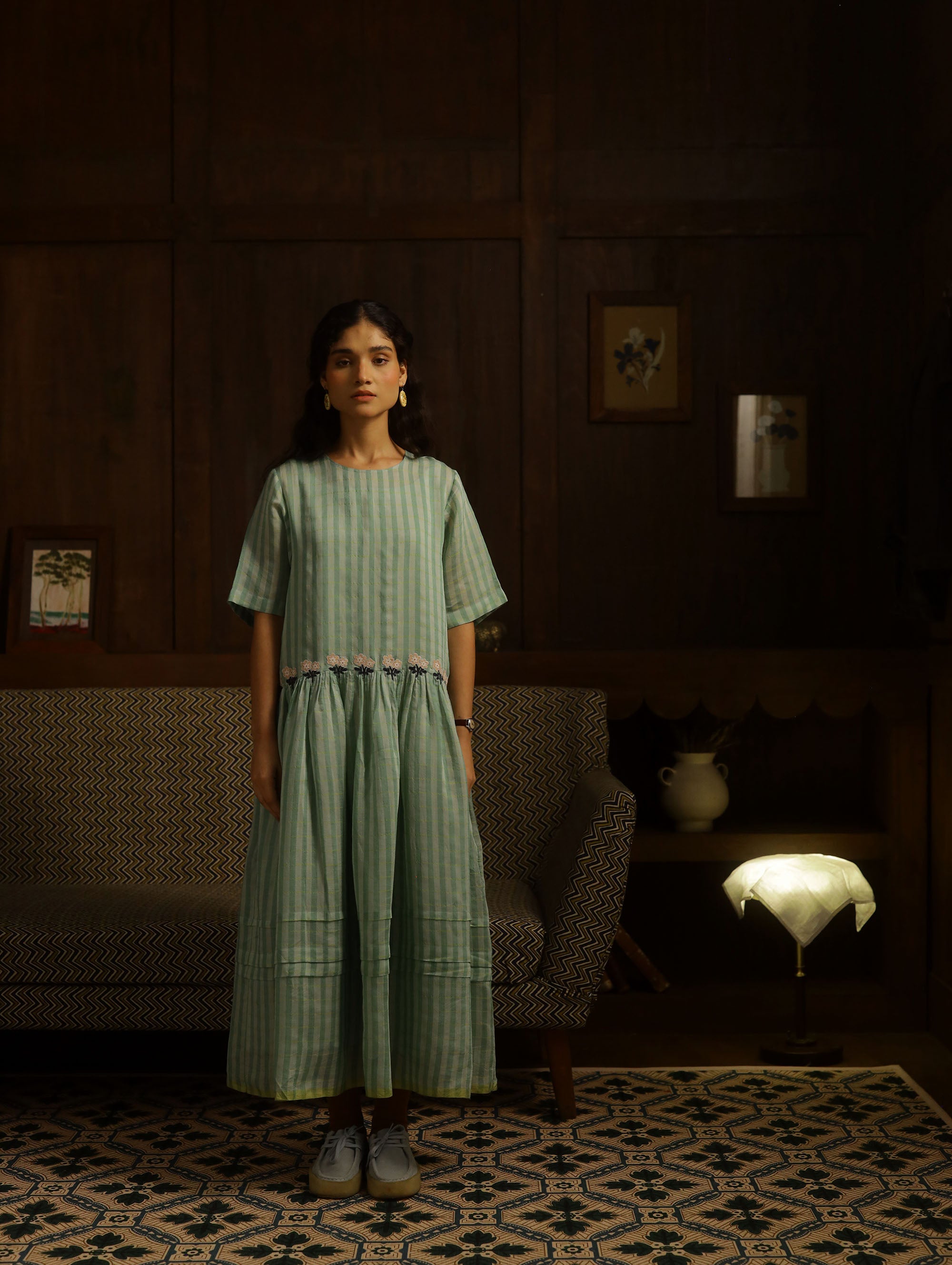 An ankle length dress with a round neck and long boxy yoke reminiscent of flapper dresses. The waist has a gathered flair with appliqued floral motifs along the seam and horizontal stripes, contrasting the vertical stripes of the bodice. The skirt has 3 pleats placed at unequal distances and a contrasting selvedge detail that adds a vivid pop of colour. The back of the bodice has a low yoke and a centre button placket with concealed buttons.