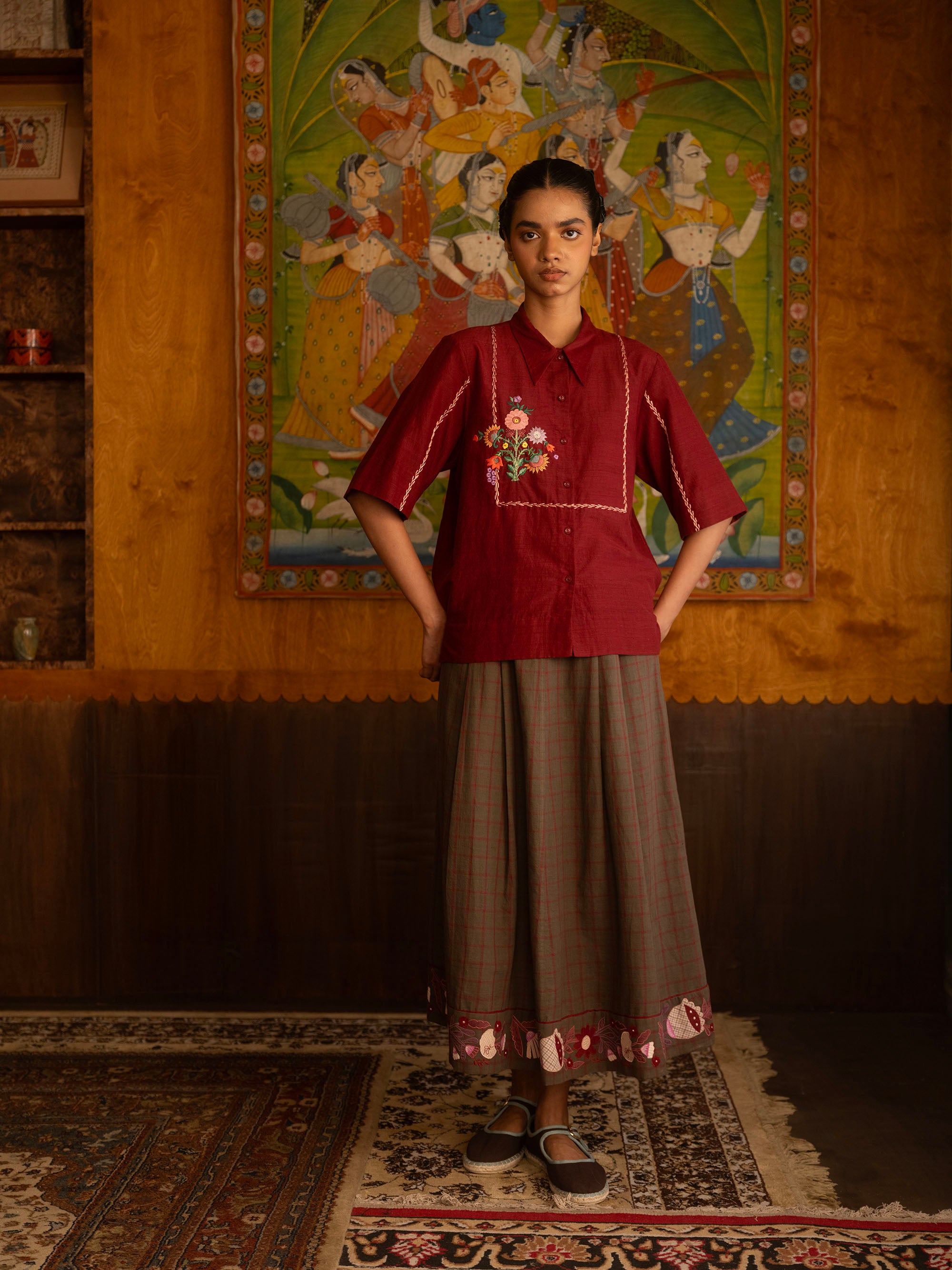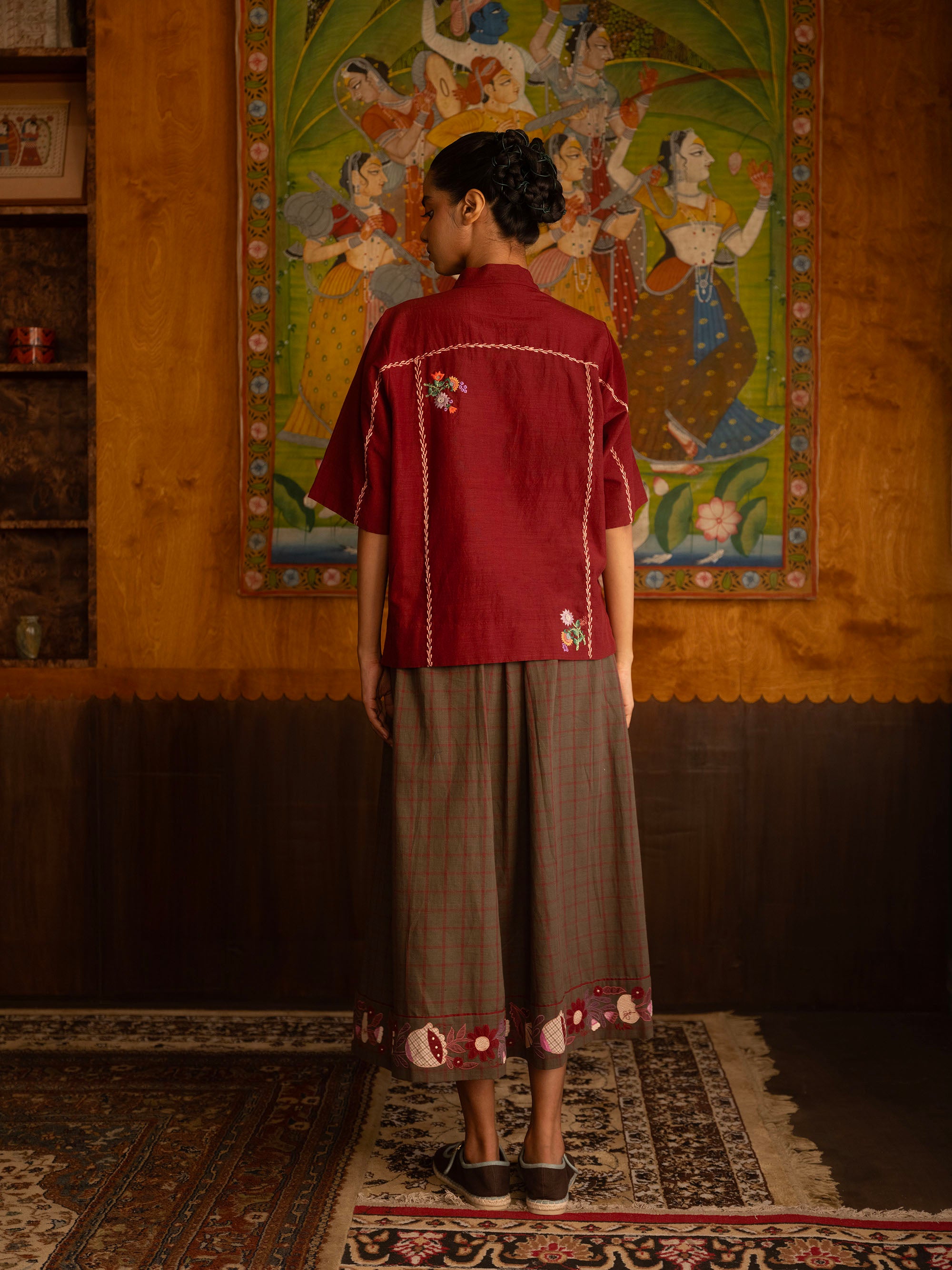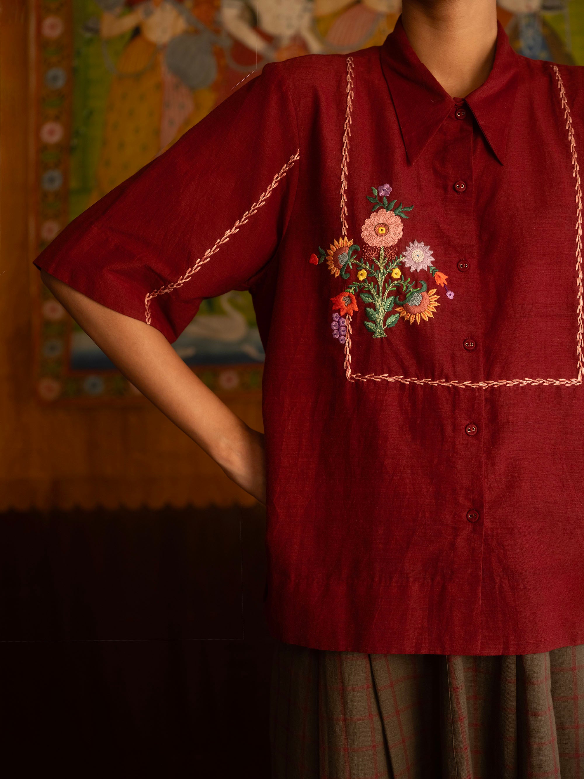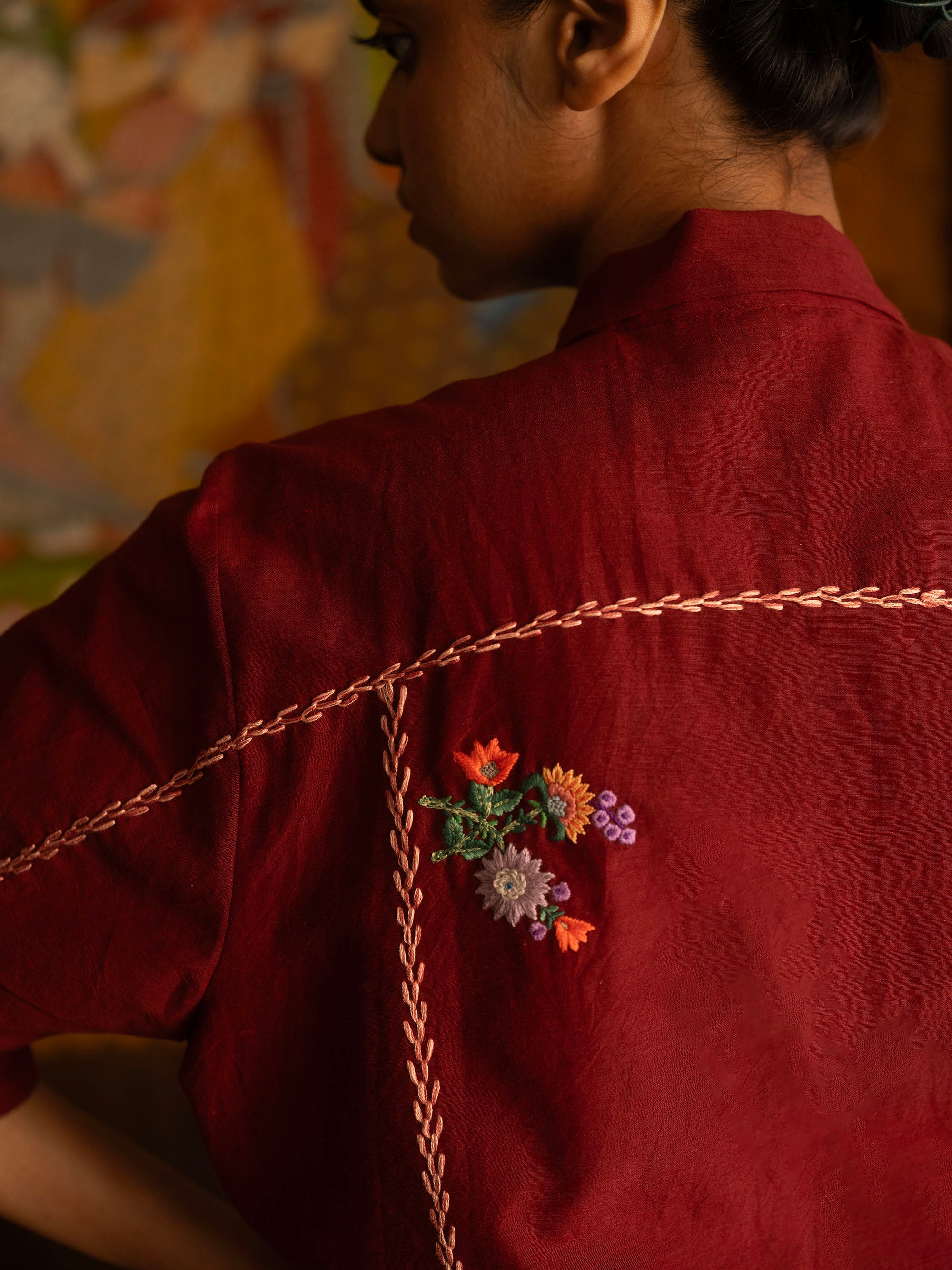 This embroidered shirt is the perfect antidote to a gloomy winter's day. It is made using a blend of Khadi cotton and mulberry silk and handembroidered using a mix of zardosi and ari techniques. It has a dramatic italian collar, and buttons along the front placket. The floral motifs are colourful and detailed, making the garment eye catching and timeless at the same time.