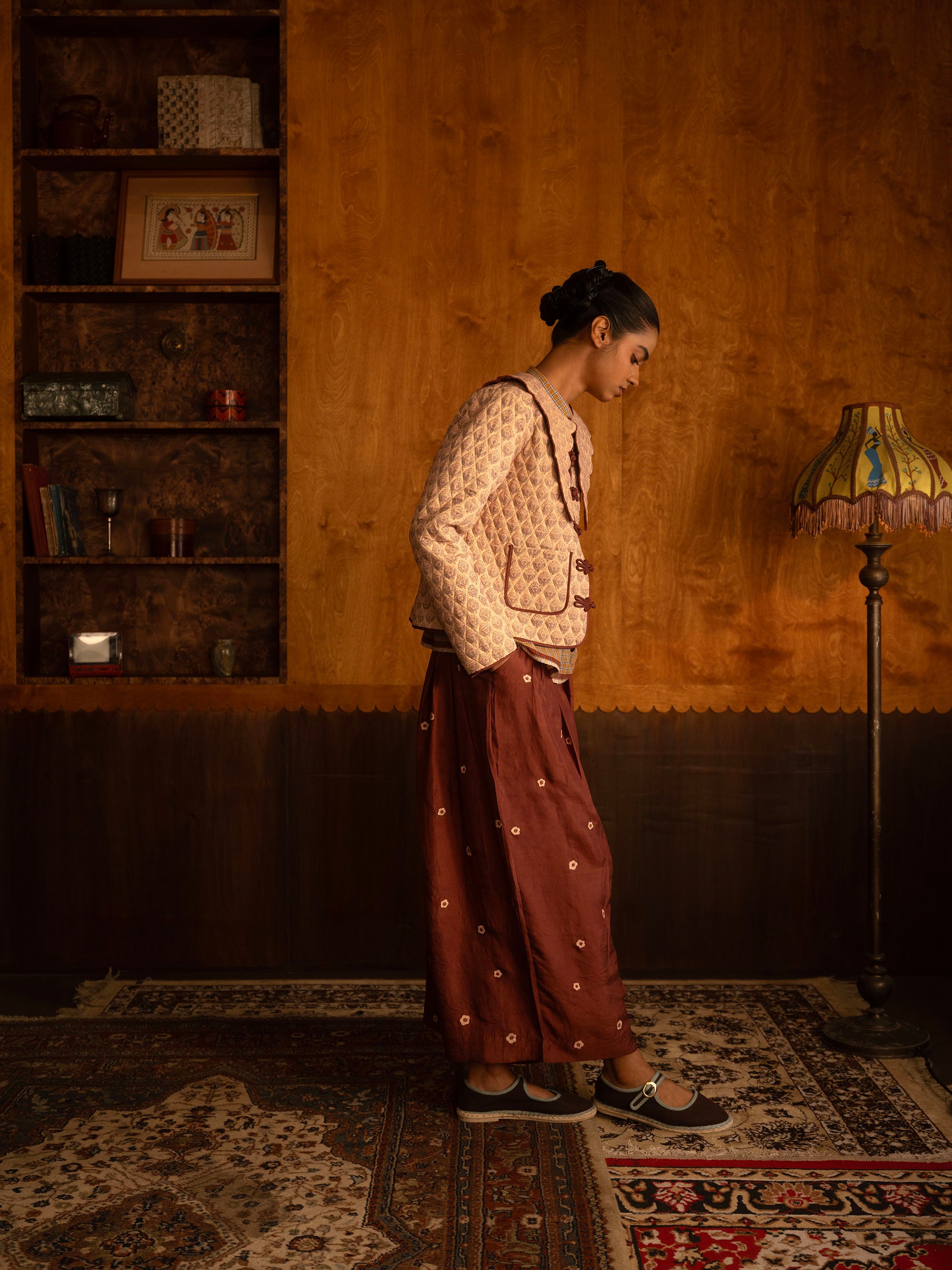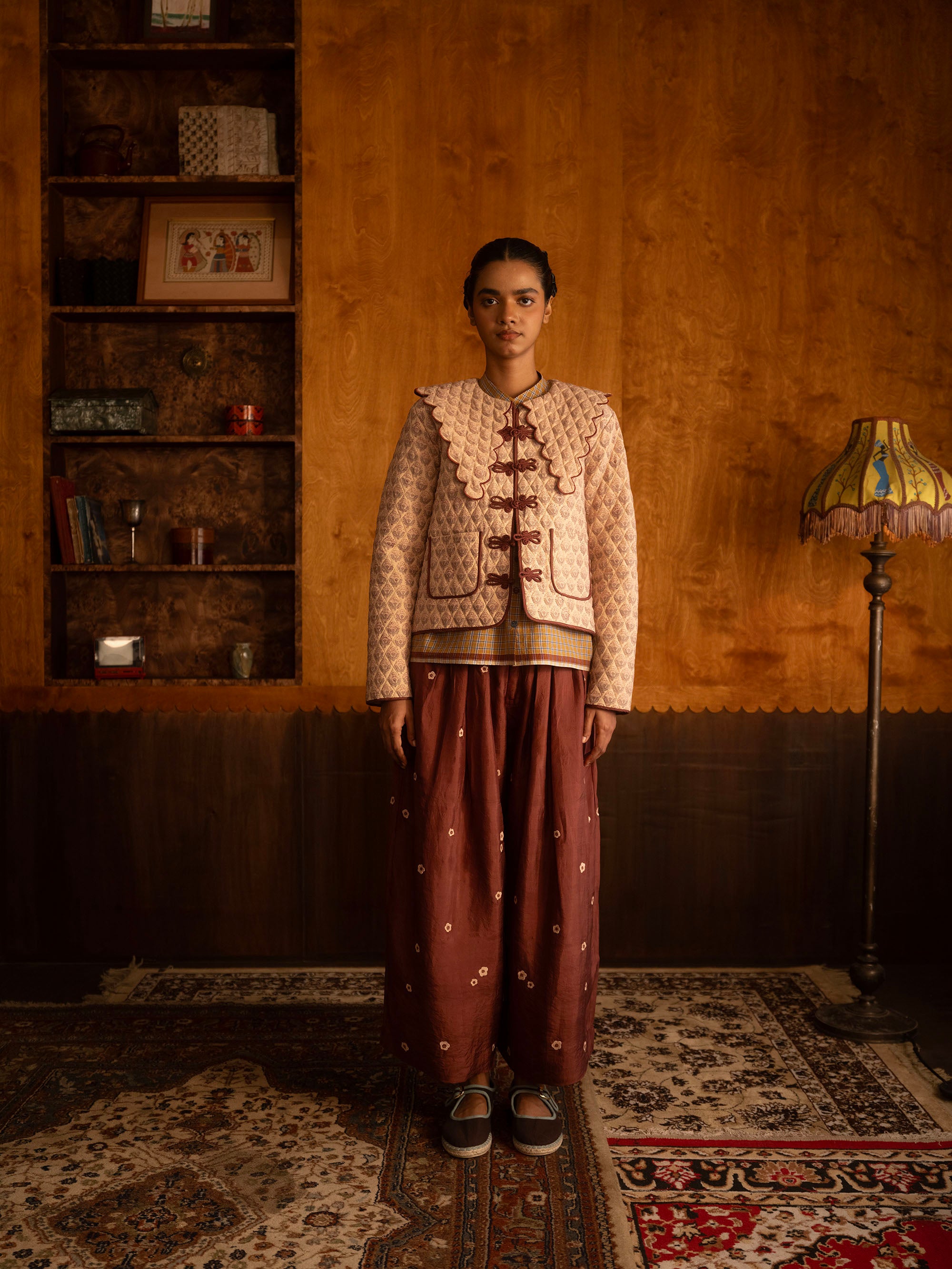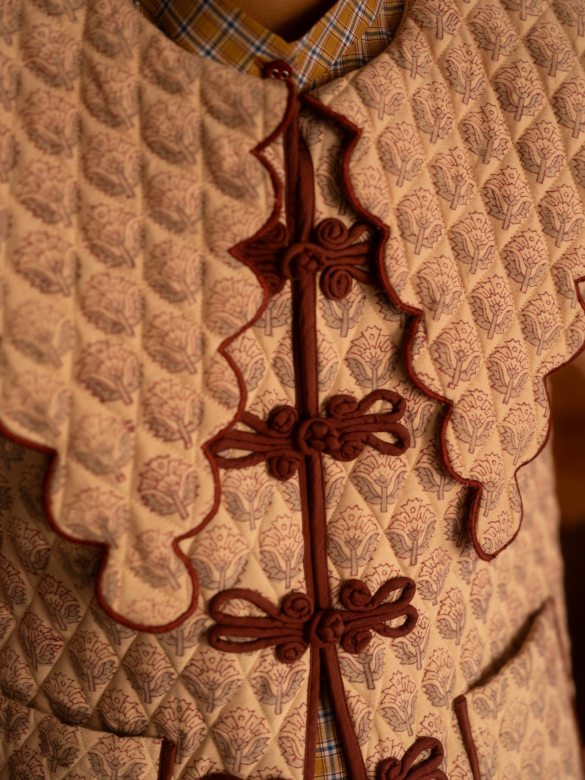 This quilted jacket can't help become your new favourite outer layer. It is constructed using A khadi cotton and mulberry silk blended textile, that's handloomed in Bengal and hand block printed in Jaipur. It is then hand quilted at our atelier using a 200 gram layer of organic cotton that results in a warm but well ventilated garment. The jacket has a wide, scalloped peterpan collar with a contrast embroidered edge. The contrast piping runs along the hem of the jacket, the cuffs and the patch pockets as well. The garment has chinese pankou style buttons that are hand made as well.