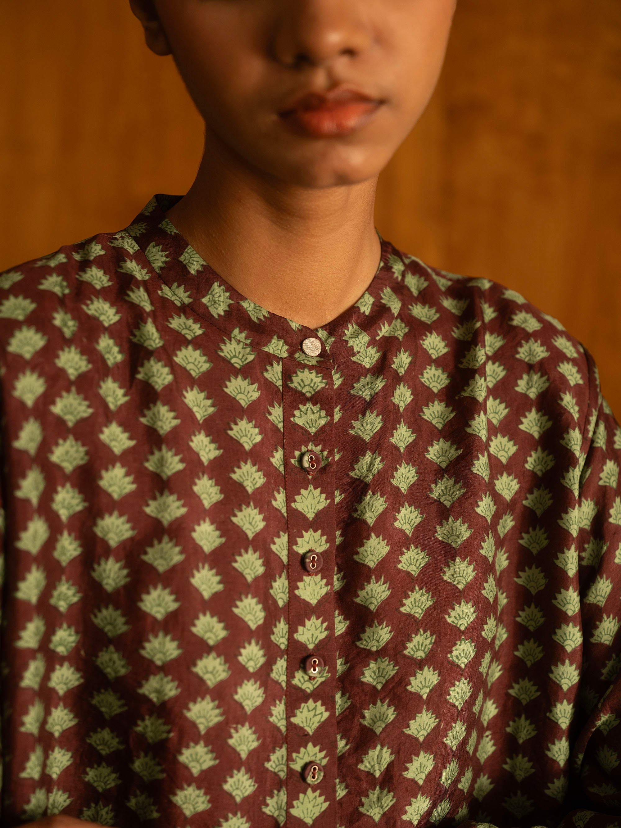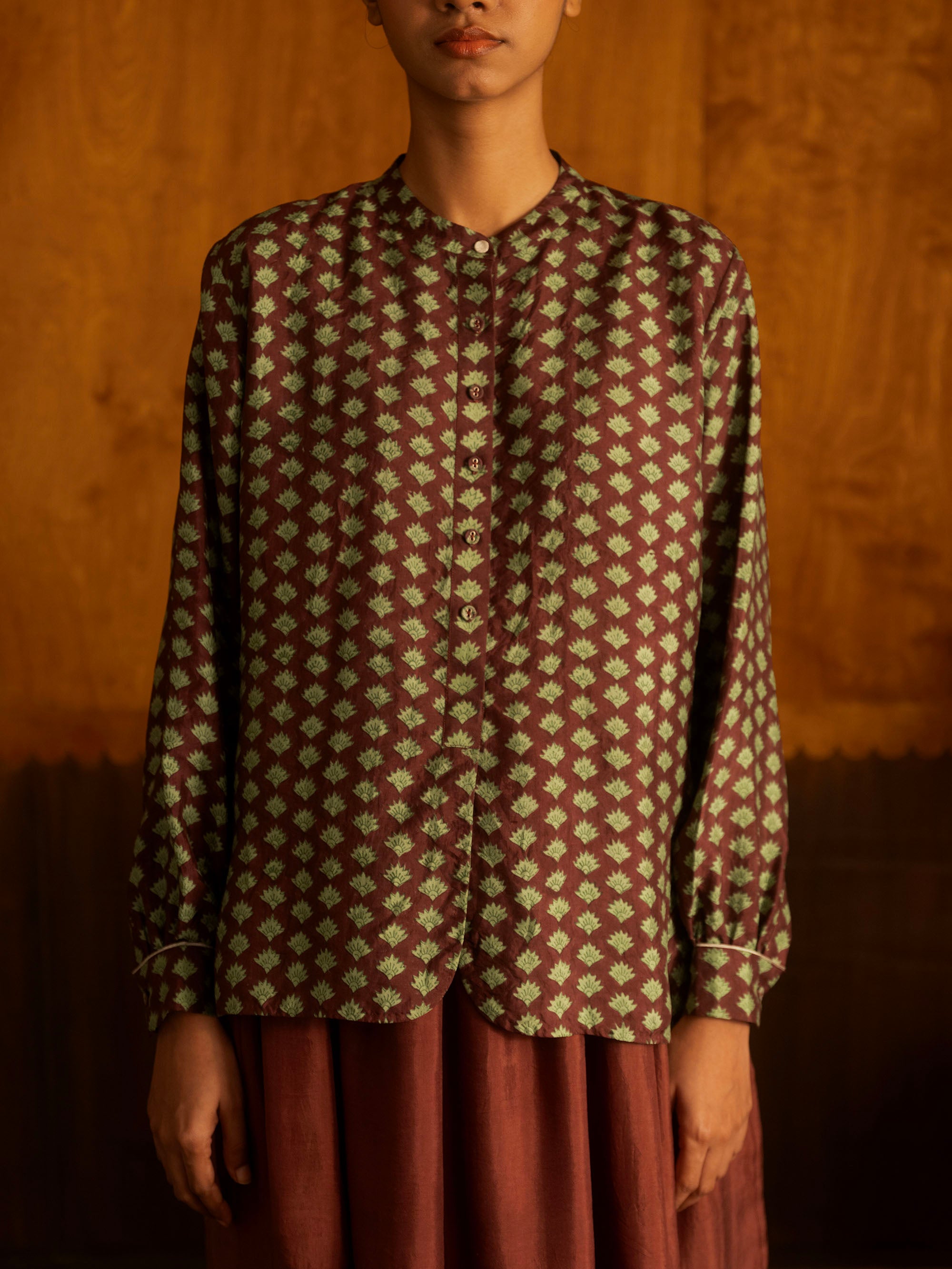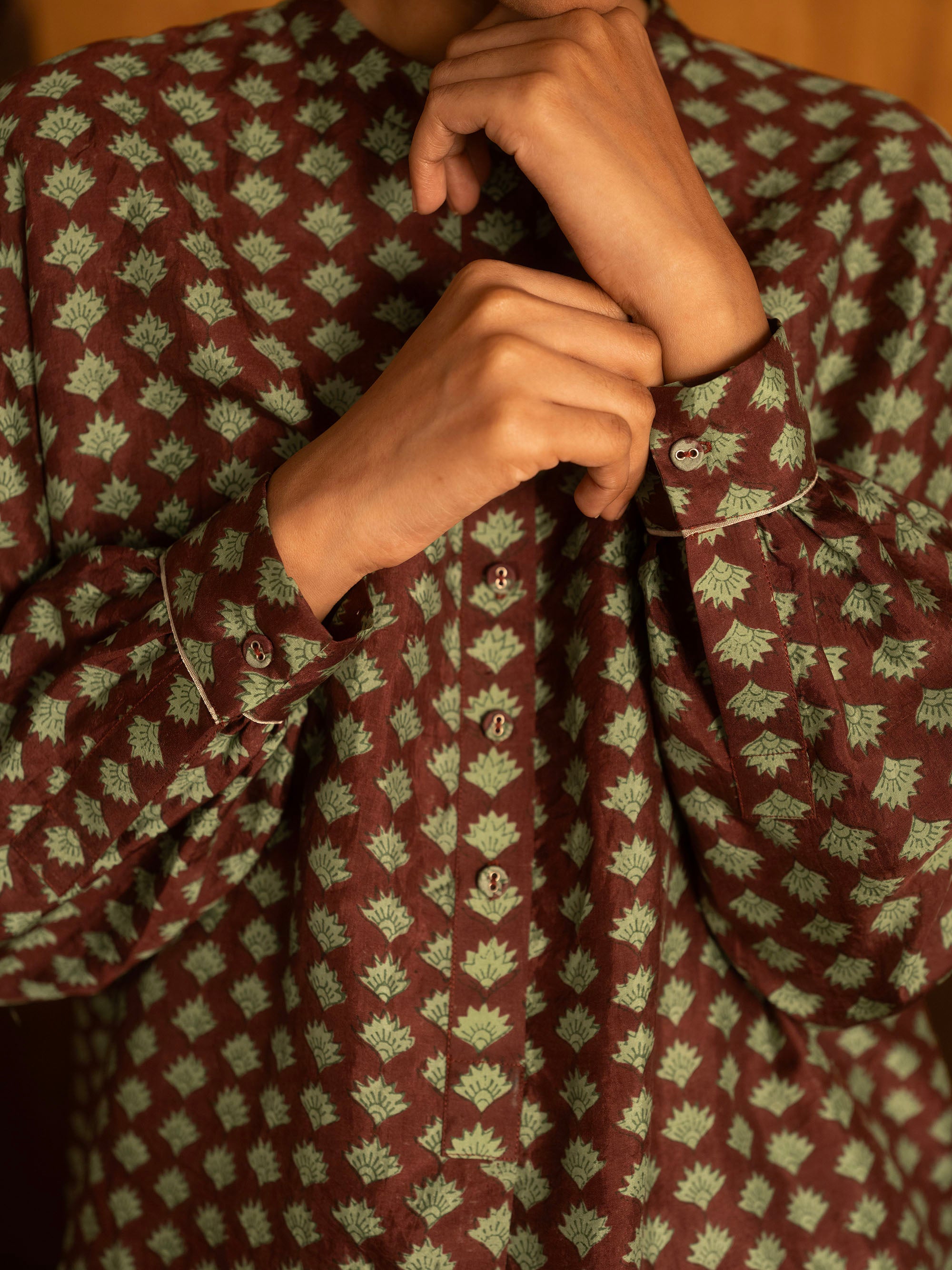 This silk button down, has a banded collar and a central placket that opens 3/4s of the way down into a curved hemline. The full length sleeves gather into a fitted cuff with a thin brocade flat piping detail. The shirt also has gathers at the back, below the yoke and a small embroidered zari brand logo. This garment is made with triply ply mulberry silk, hand loomed in Bengal and hand block printed in Jaipur, before being immaculately tailored at our atelier in Calcutta.