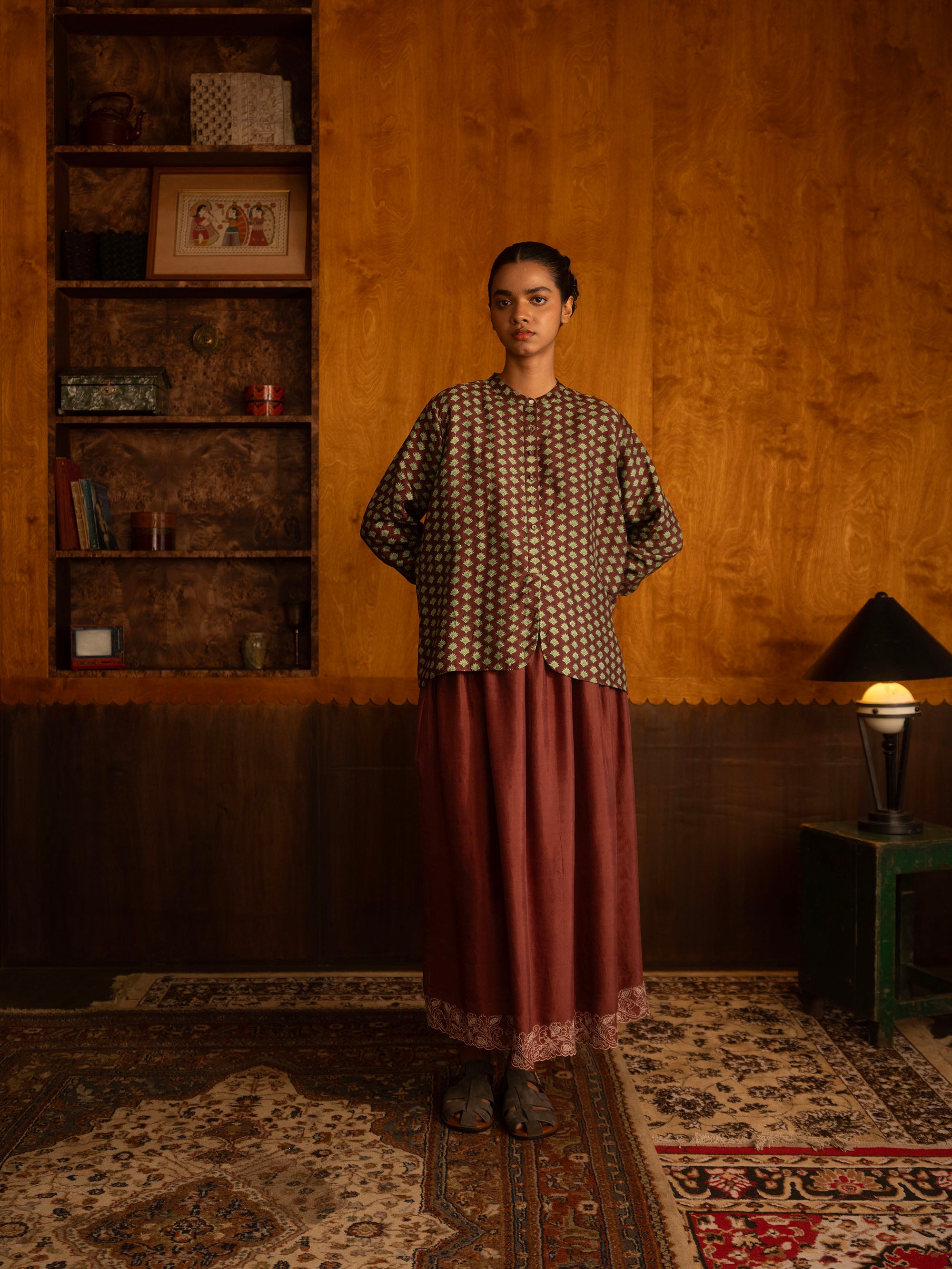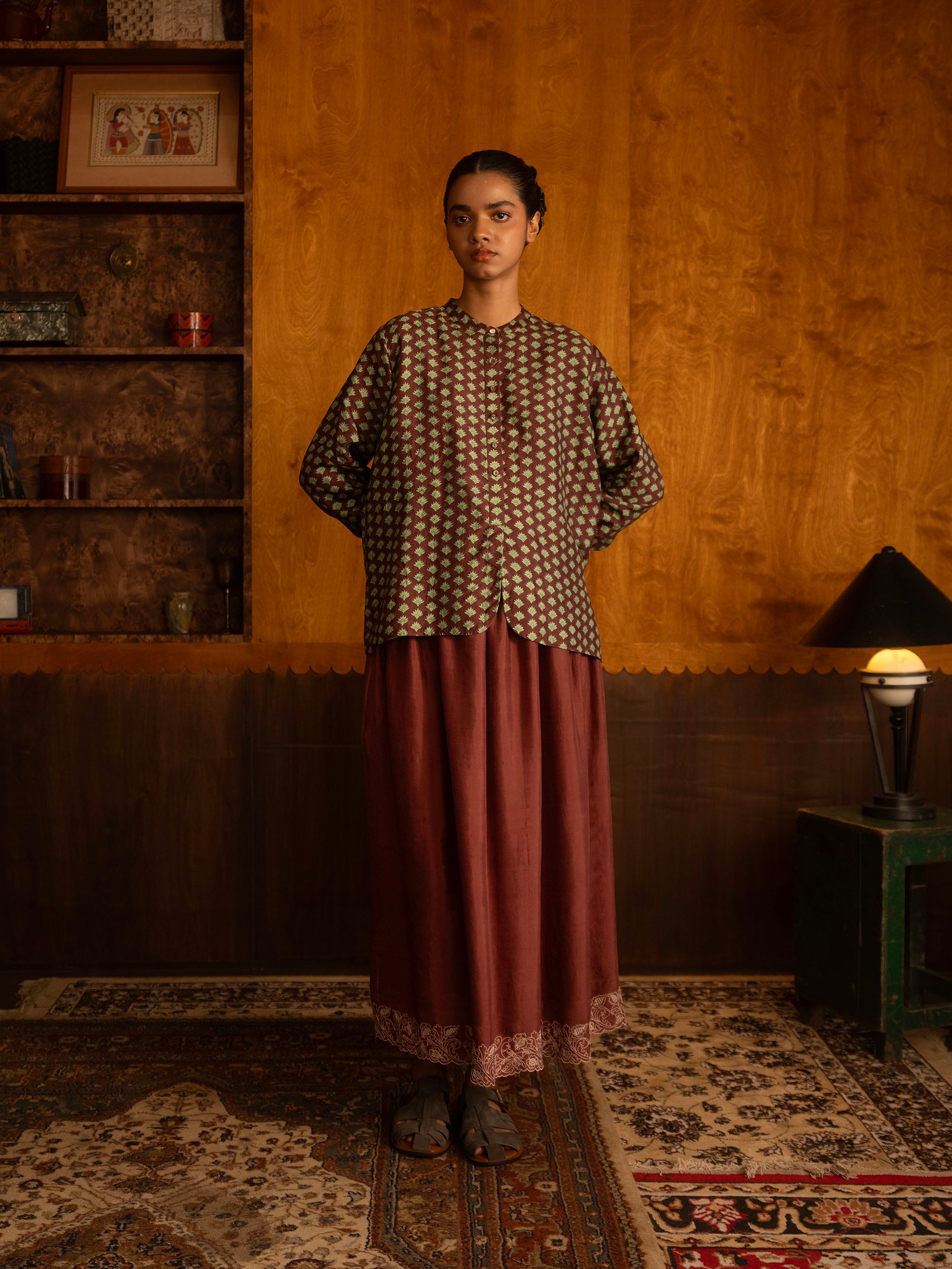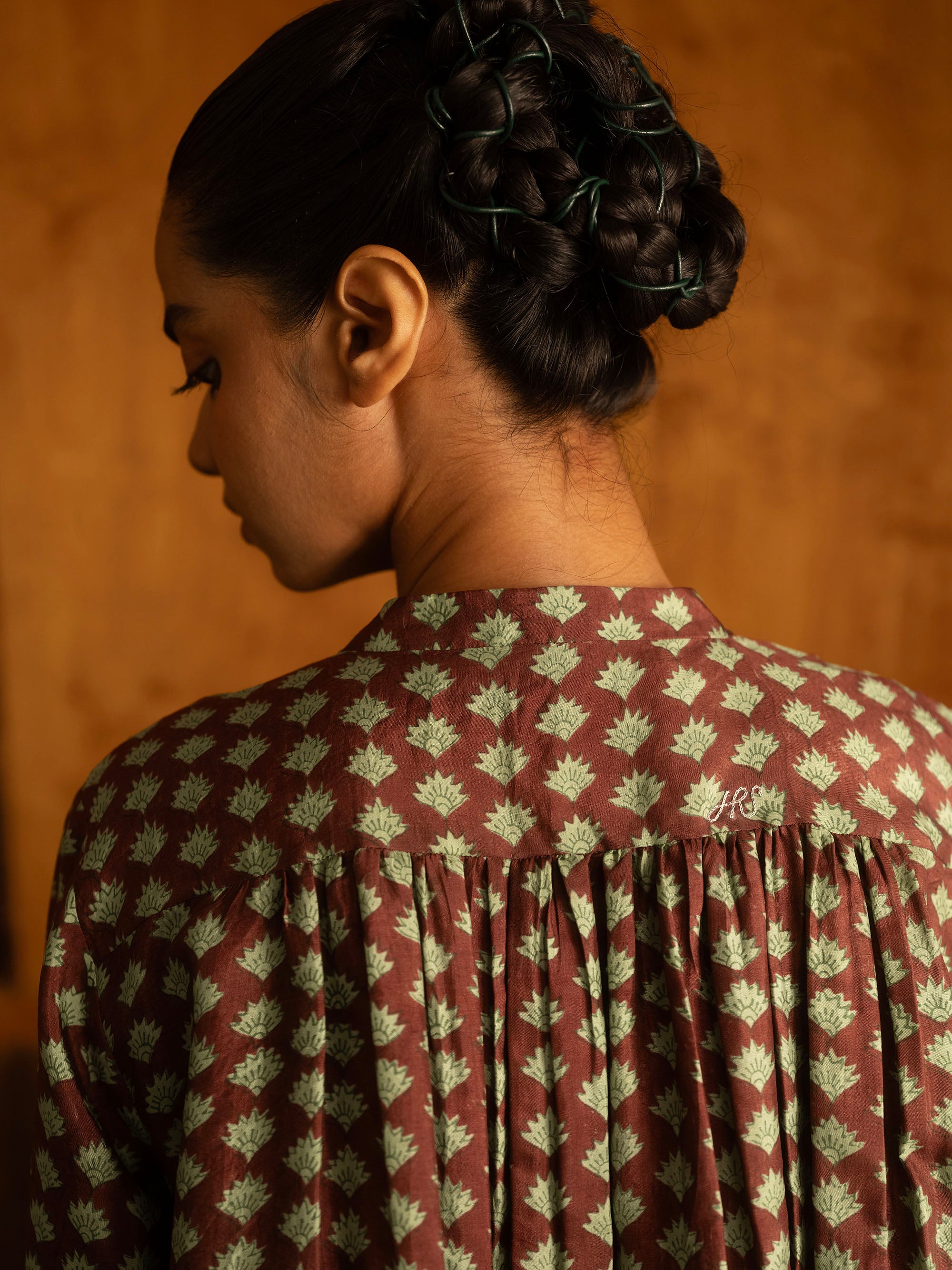 This silk button down, has a banded collar and a central placket that opens 3/4s of the way down into a curved hemline. The full length sleeves gather into a fitted cuff with a thin brocade flat piping detail. The shirt also has gathers at the back, below the yoke and a small embroidered zari brand logo. This garment is made with triply ply mulberry silk, hand loomed in Bengal and hand block printed in Jaipur, before being immaculately tailored at our atelier in Calcutta.