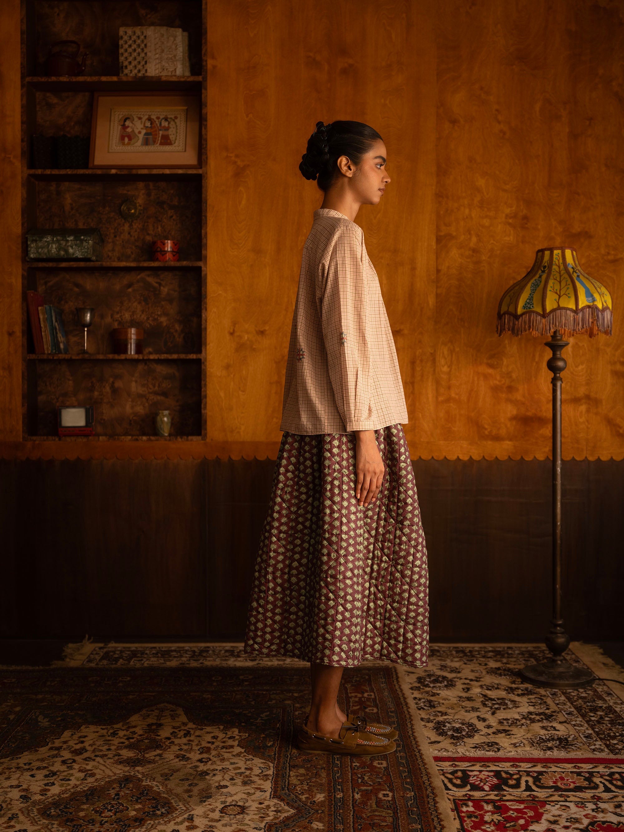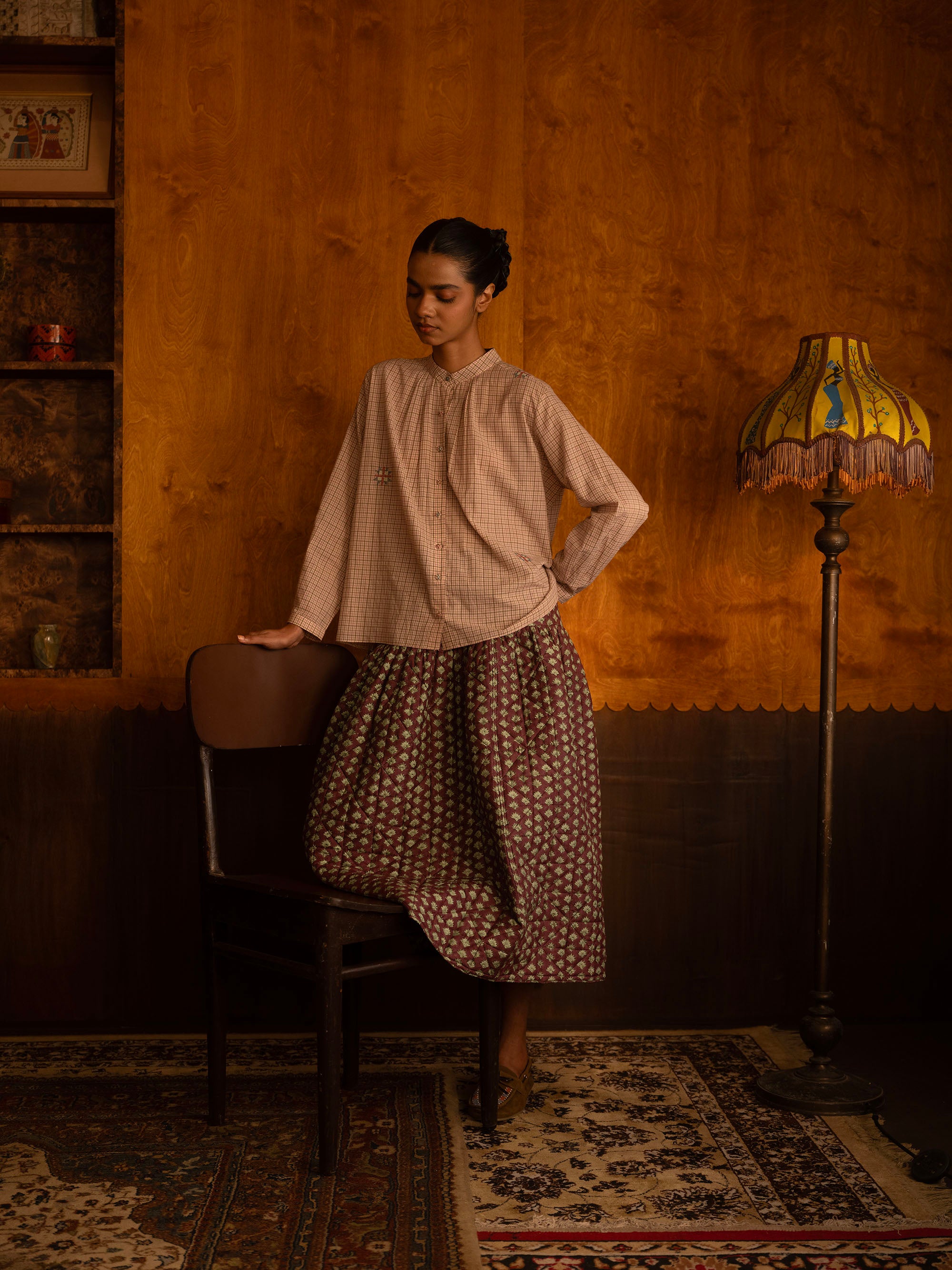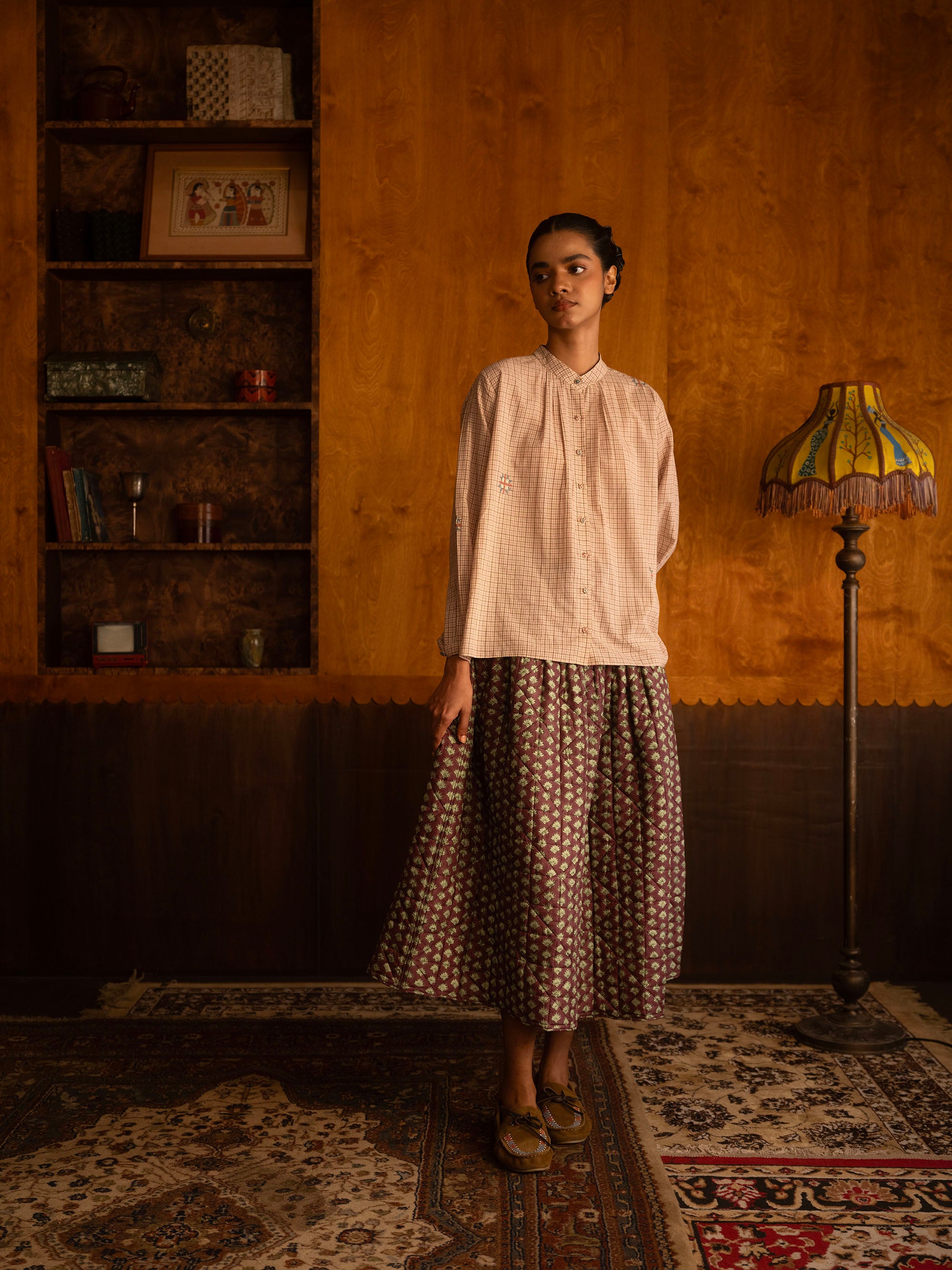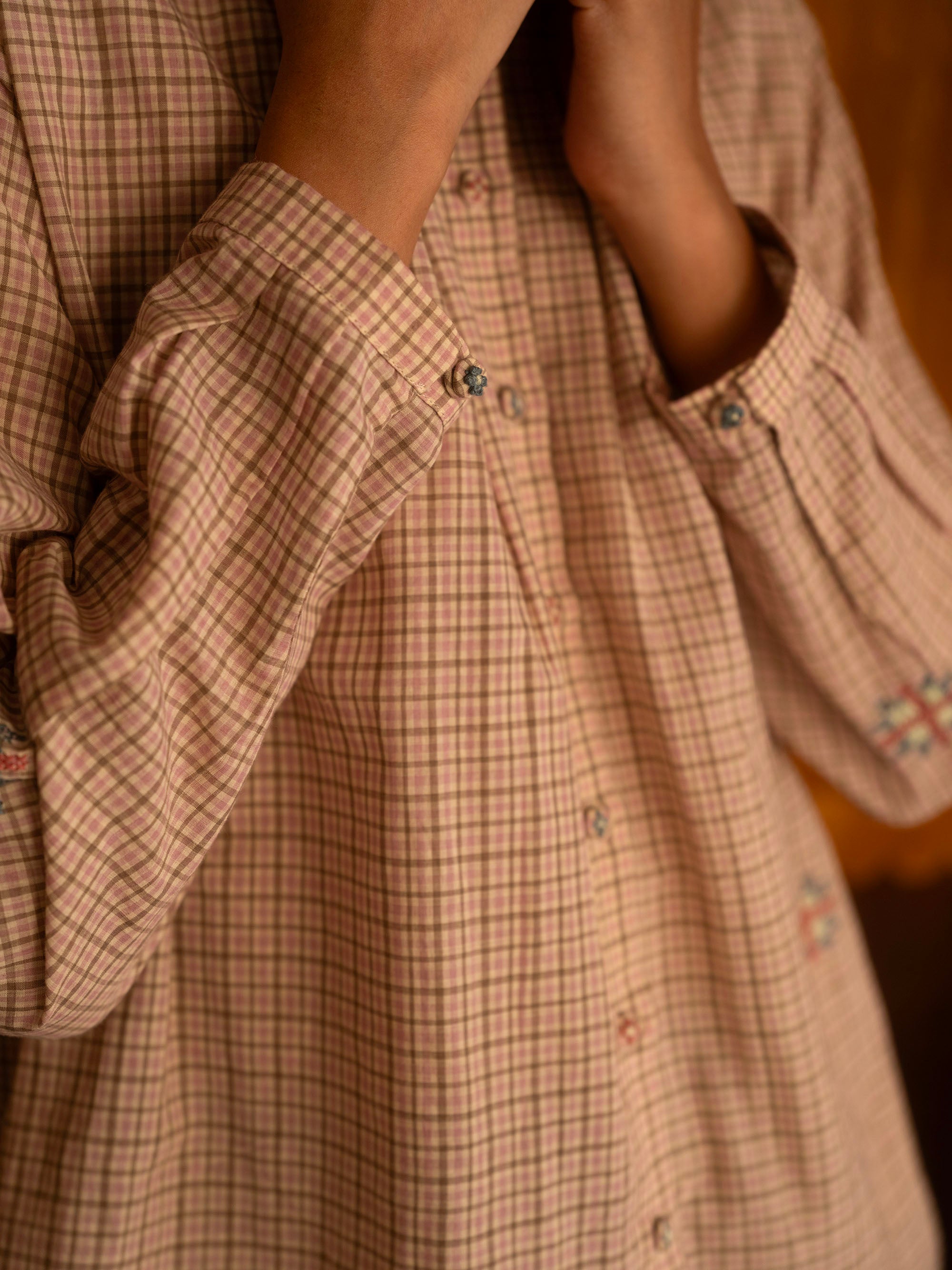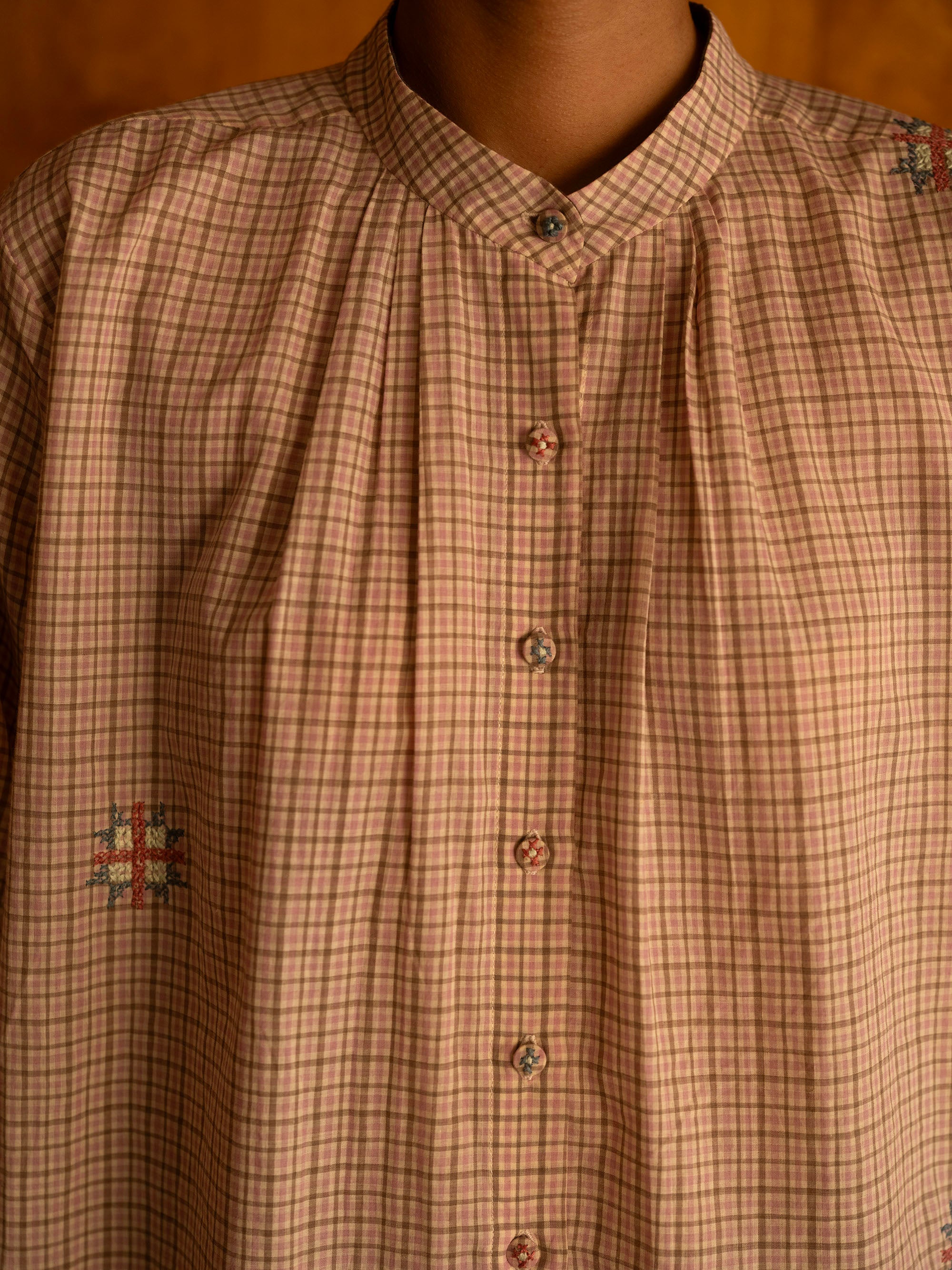The She knows what she likes Shirt is a slightly cropped full sleeved button down shirt that can be worn both tucked in or out. It has a banded collar and pleats on either side of the placket. The shirt has a short back yoke with a box pleat detail on either side. The garment has hand embroidered cross stitched motifs scattered all over and hand embroidered buttons on the front and cuffs. This shirt is made with 100 count handloom cotton, woven in West Bengal and crafted to perfection at our atelier in Calcutta.