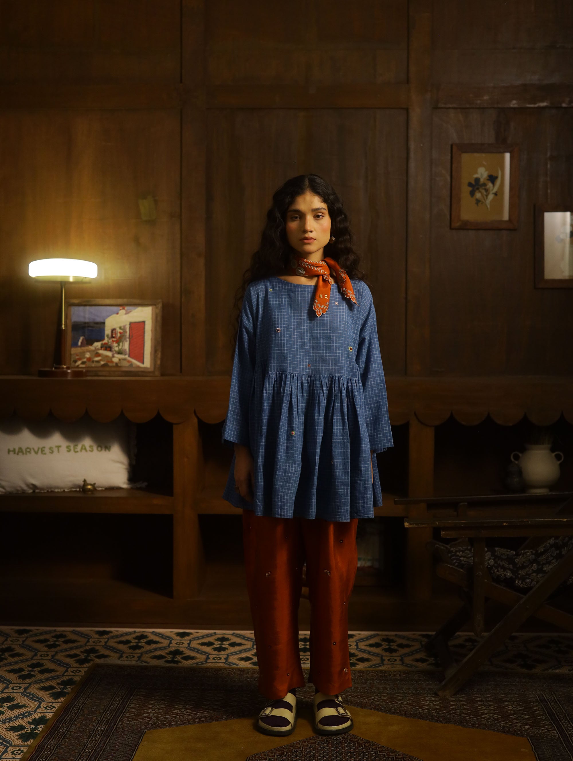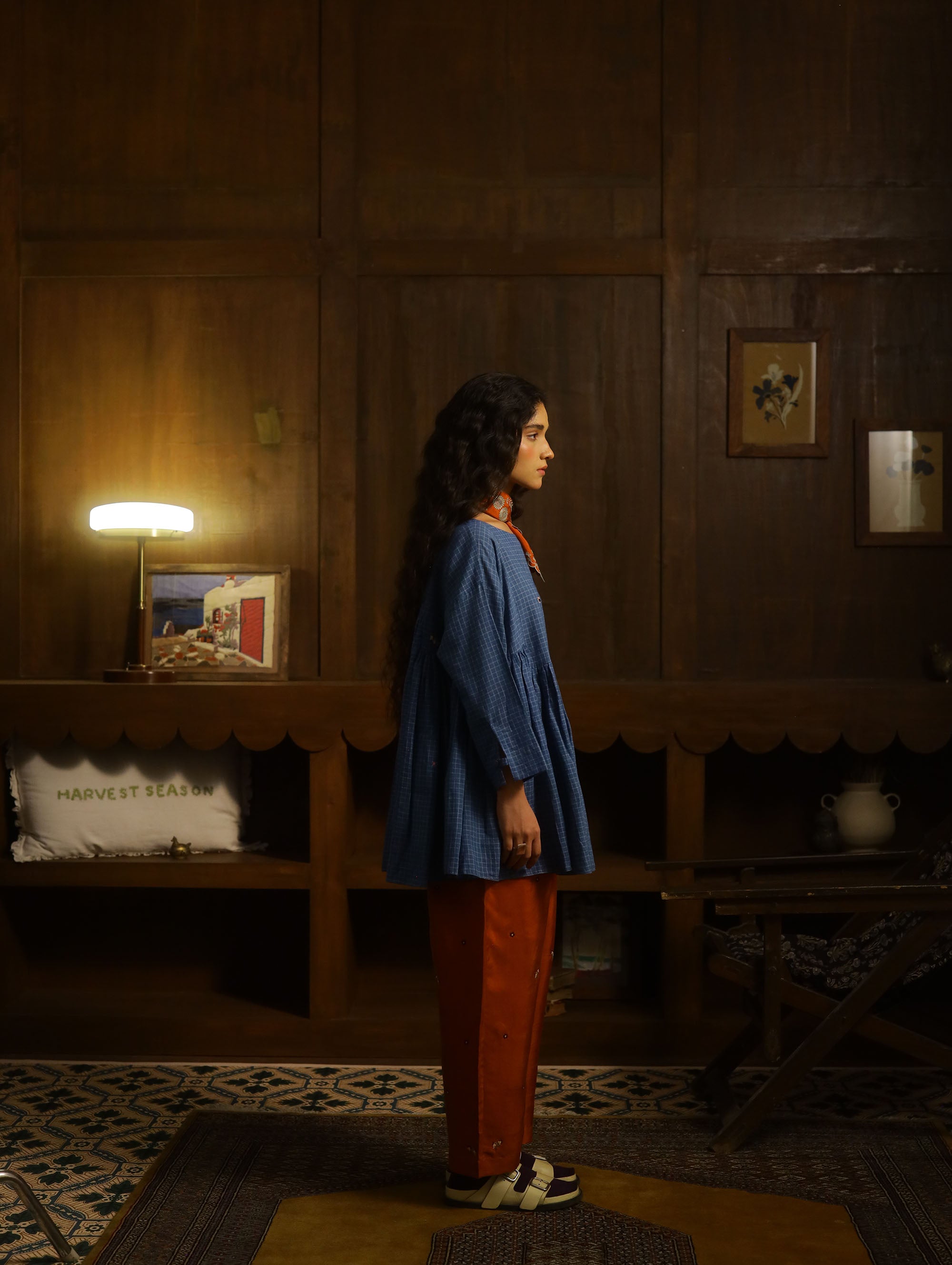 The top is constructed in fine handloomed Bengal muslin, a light breathable material known historically for being the perfect textile for warm summers.