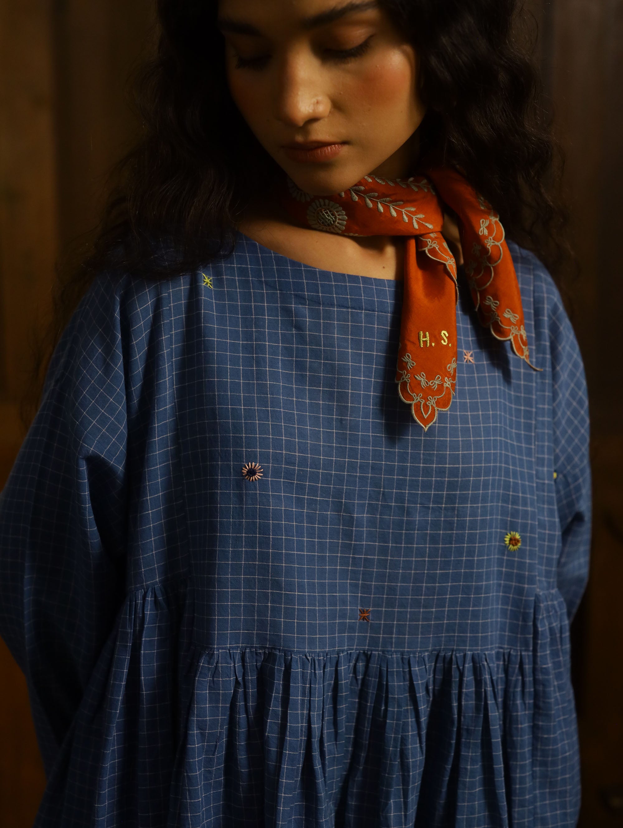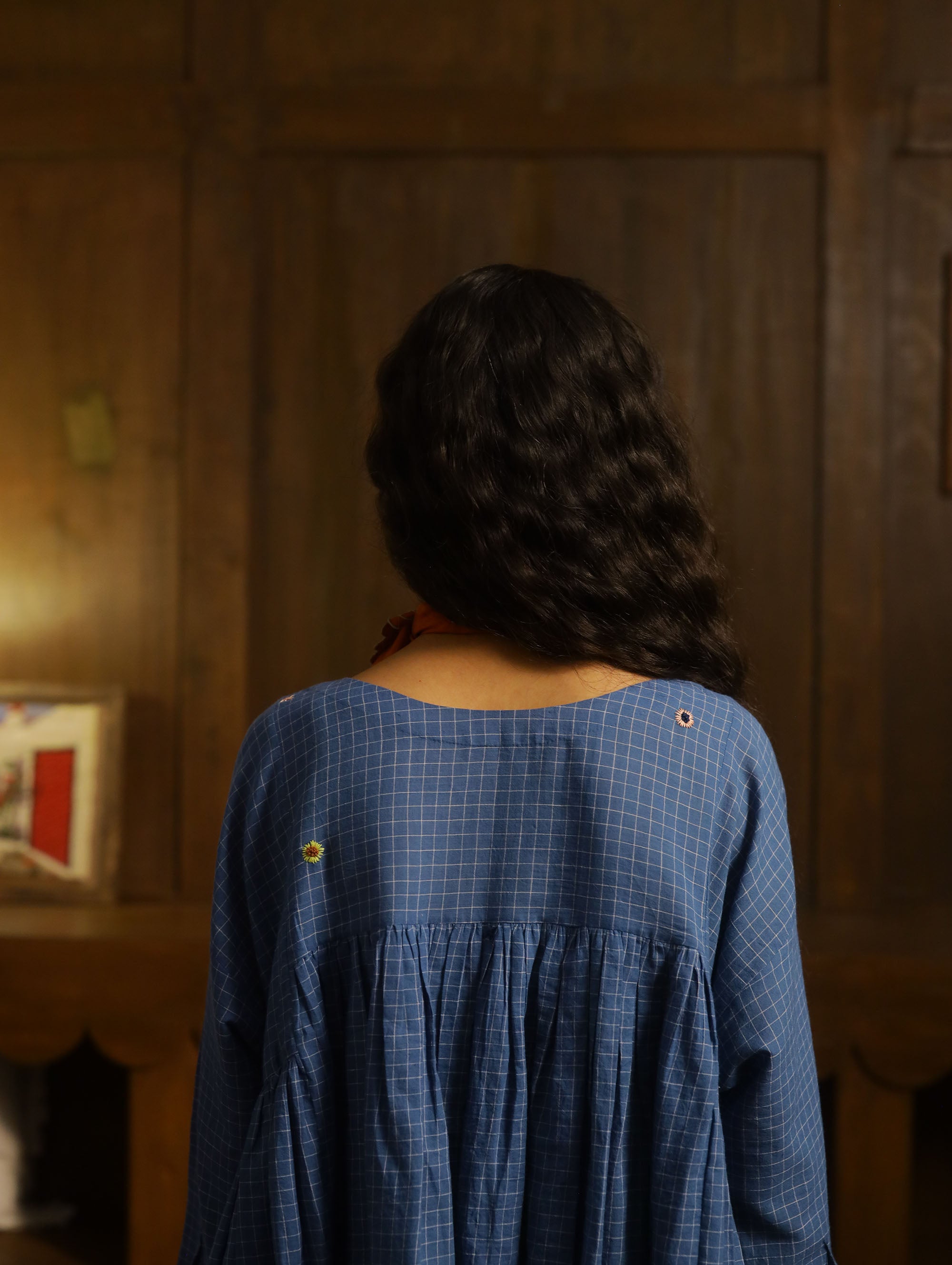 A babydoll dress inspired top with asymmetrical yokes on the front and back and a finely gathered along the waist to create a voluminous skirt. The garment has 3/4 sleeves, with a button closure, and embroidery along the cuffs. It has a boat neckline and scattered floral motifs of sunflowers and daisies all over the front and back bodice and the brand initials are embroidered using french knots on the back yoke.